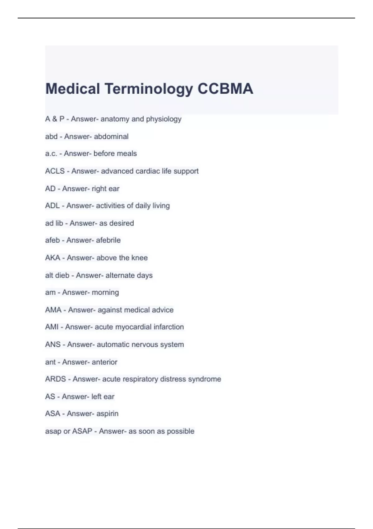 1 Exam (elaborations) Medical Terminology CCBMA Exam Questions and Answers 2 Exam (elaborations) MA Study Guide - California Certifying Board of Medical Assistants Questions and Answers 3 Exam (elaborations) CCBMA Review Exam Questions with correct Answers. 4 Exam (elaborations) CCBMA Study Guide with complete solutions /Graded A 5 Exam (elabor
