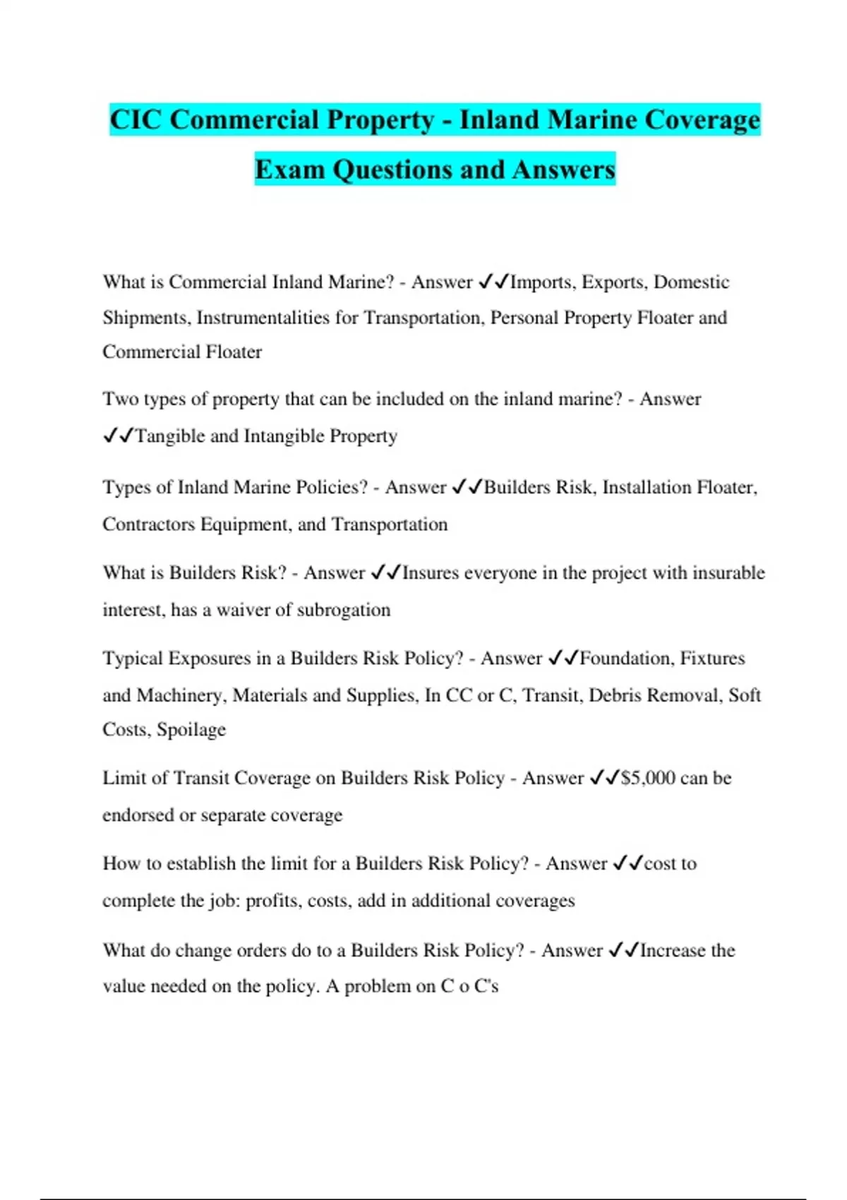 CIC Commercial Property - Inland Marine Coverage Exam Questions and Answers