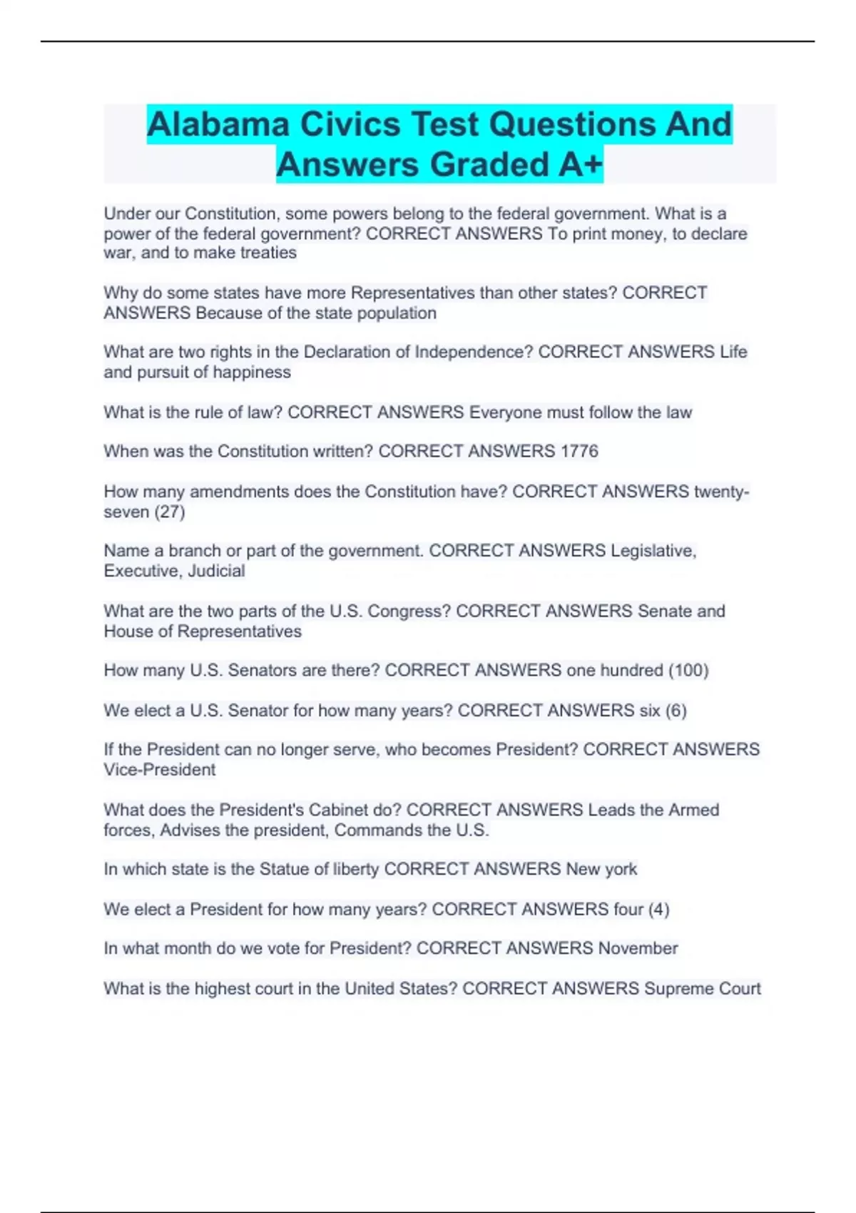 Alabama Civics Test Questions And Answers Graded A+ Alabama Civics Test Questions And Answers Already Passed Alabama Civics Exam Complete Questions And Answers Alabama Civics Exam Questions And Correct Answers
