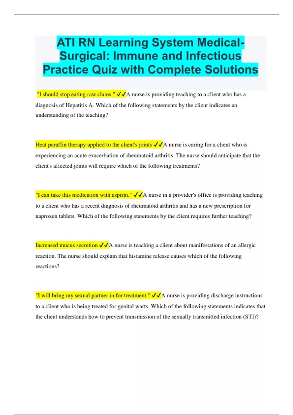 ATI RN Learning System Medical- Surgical: Immune and Infectious Practice Quiz with Complete Solutions