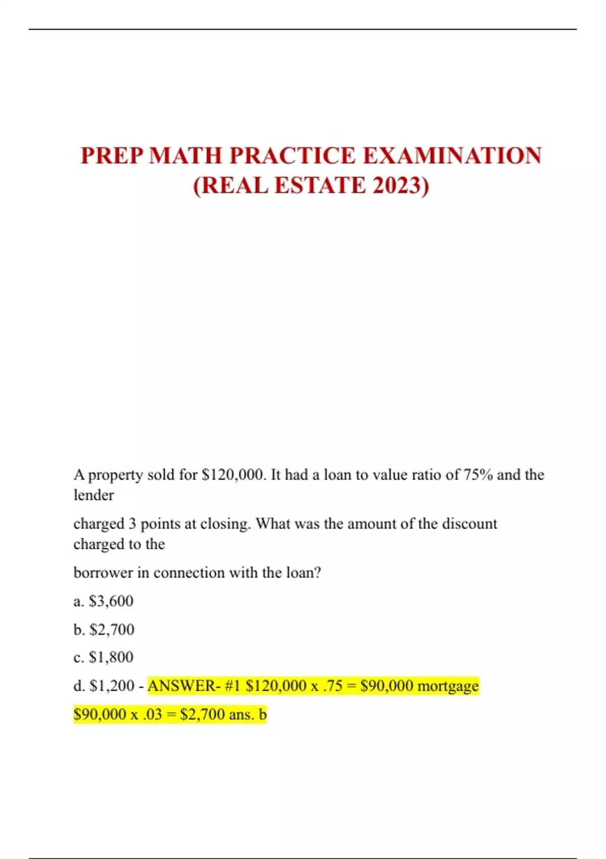 PREP MATH PRACTICE EXAMINATION (REAL ESTATE 2023)
