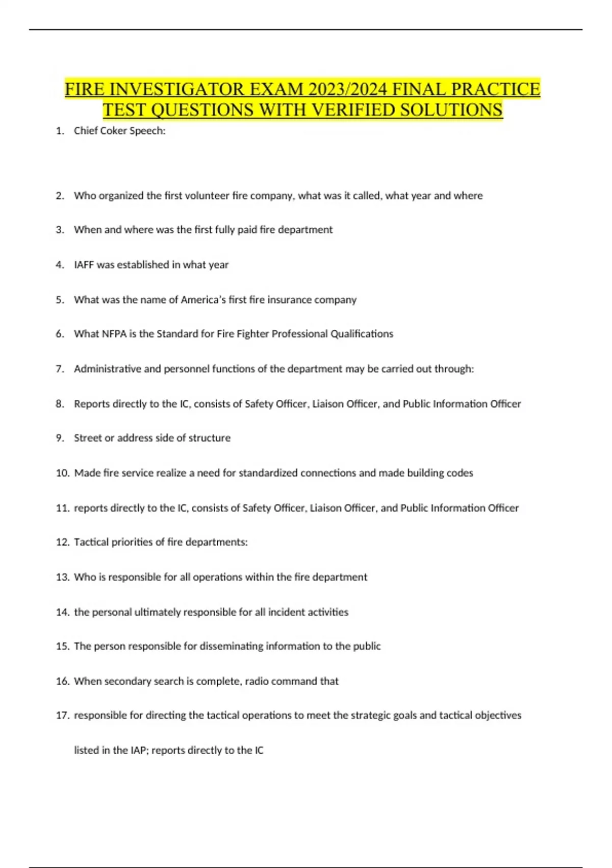 CERTIFIED FIRE INVESTIGATOR EXAM 2024 WITH LATEST TEST QUESTIONS WITH VERIFIED MULTIPLE CHOICE SOLUTIONS