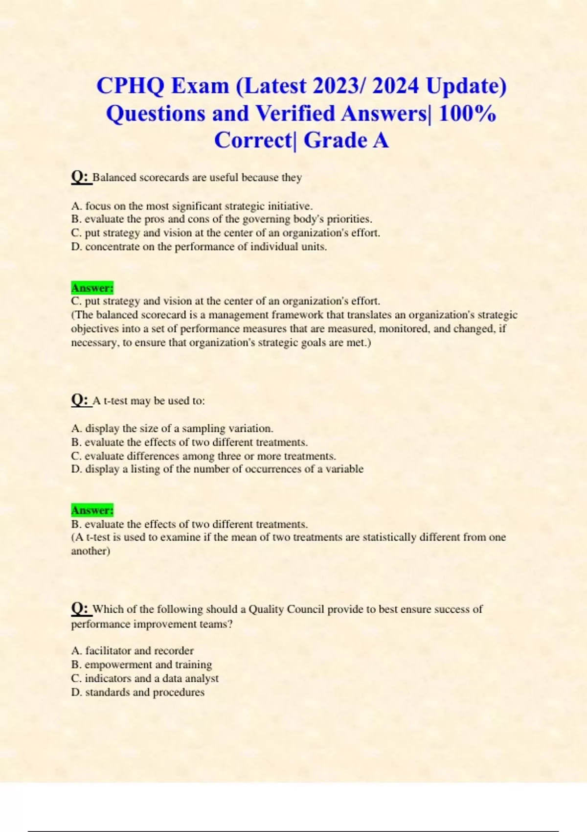 NAHQ CPHQ Practice Exam (Latest 2023/ 2024 Update) Questions and Verified Answers| 100% Correct| Grade A