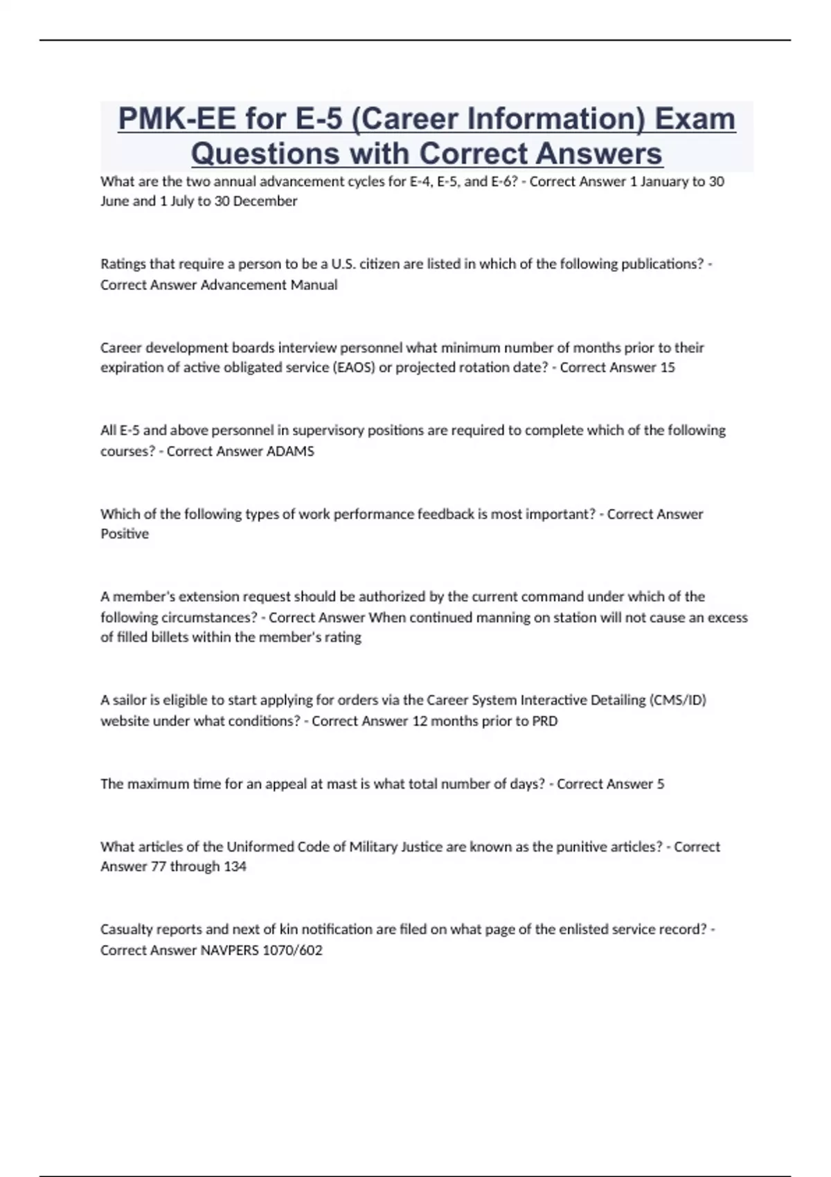 E5 Career Information PMK-EE for E5 Questions with Correct Answers 100% Verified Graded A+