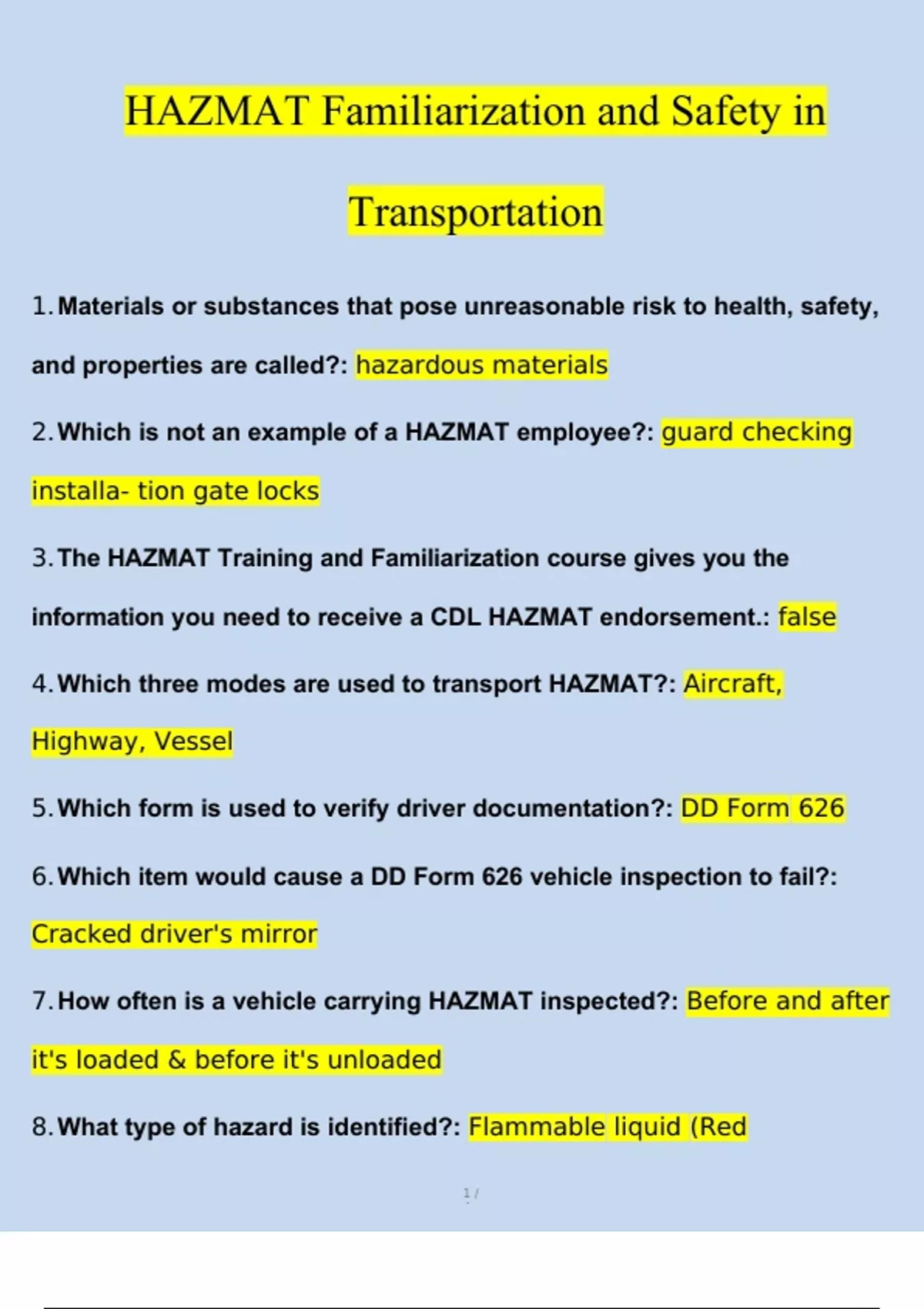 Hazmat Familiarization and Safety In Transportation BUNDLED Q&A 2024