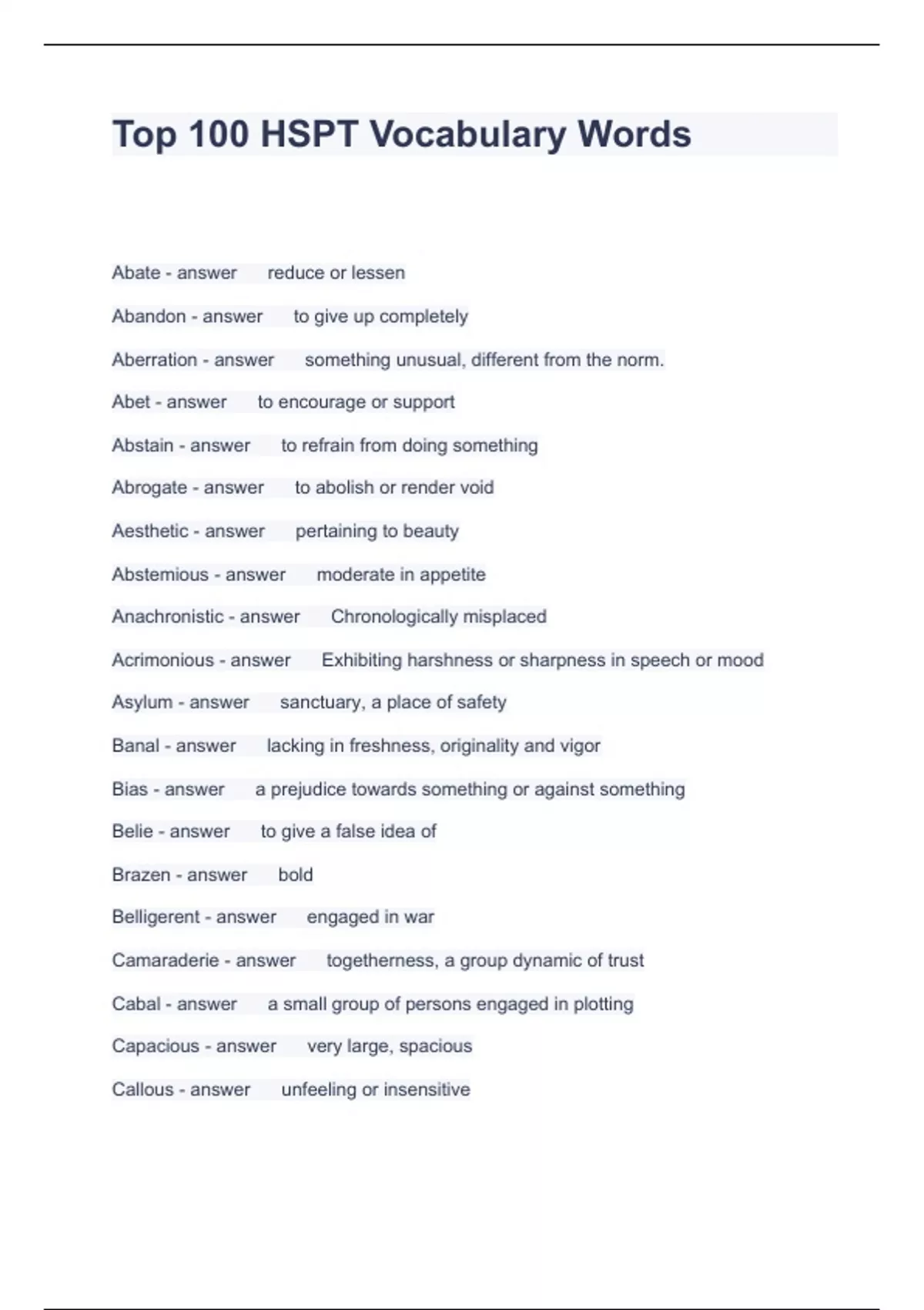 Exam (elaborations) Barron's HSPT Vocab A-Z Questions and Answers Graded A+ Exam (elaborations) Grammar Practice for the HSPT Questions and Answers Rated A+ Exam (elaborations) High School Placement Test Study Questions with correct Answers 2024 Exam (elaborations) HSPT 300 Spelling Words Questions with correct Answers 2024 Exam (elaborati