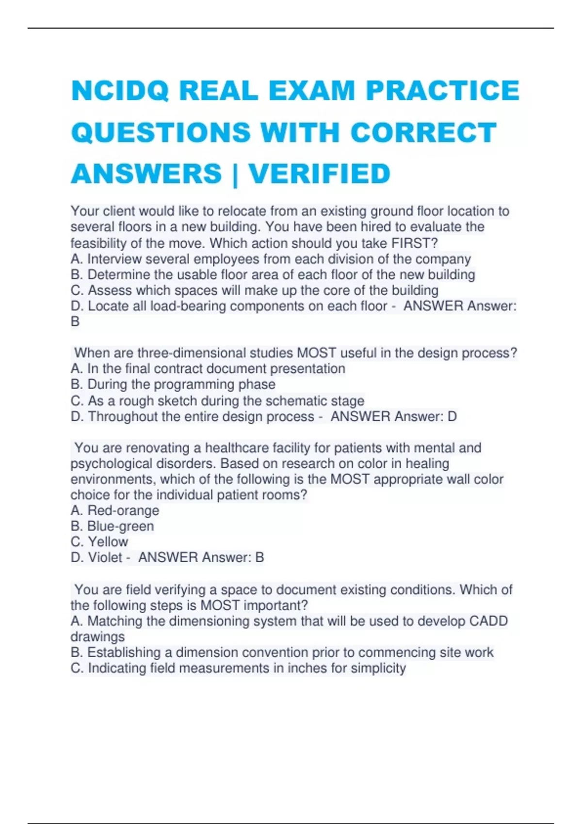 bundle for NCIDQ REAL EXAM PRACTICE QUESTIONS WITH CORRECT ANSWERS | VERIFIED