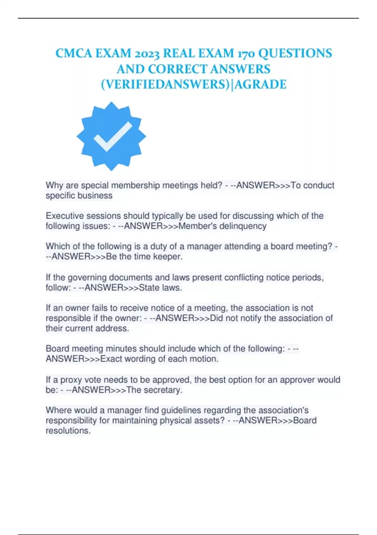 CMCA EXAM 2023 REAL EXAM 170 QUESTIONS AND CORRECT ANSWERS (VERIFIEDANSWERS)|AGRADE