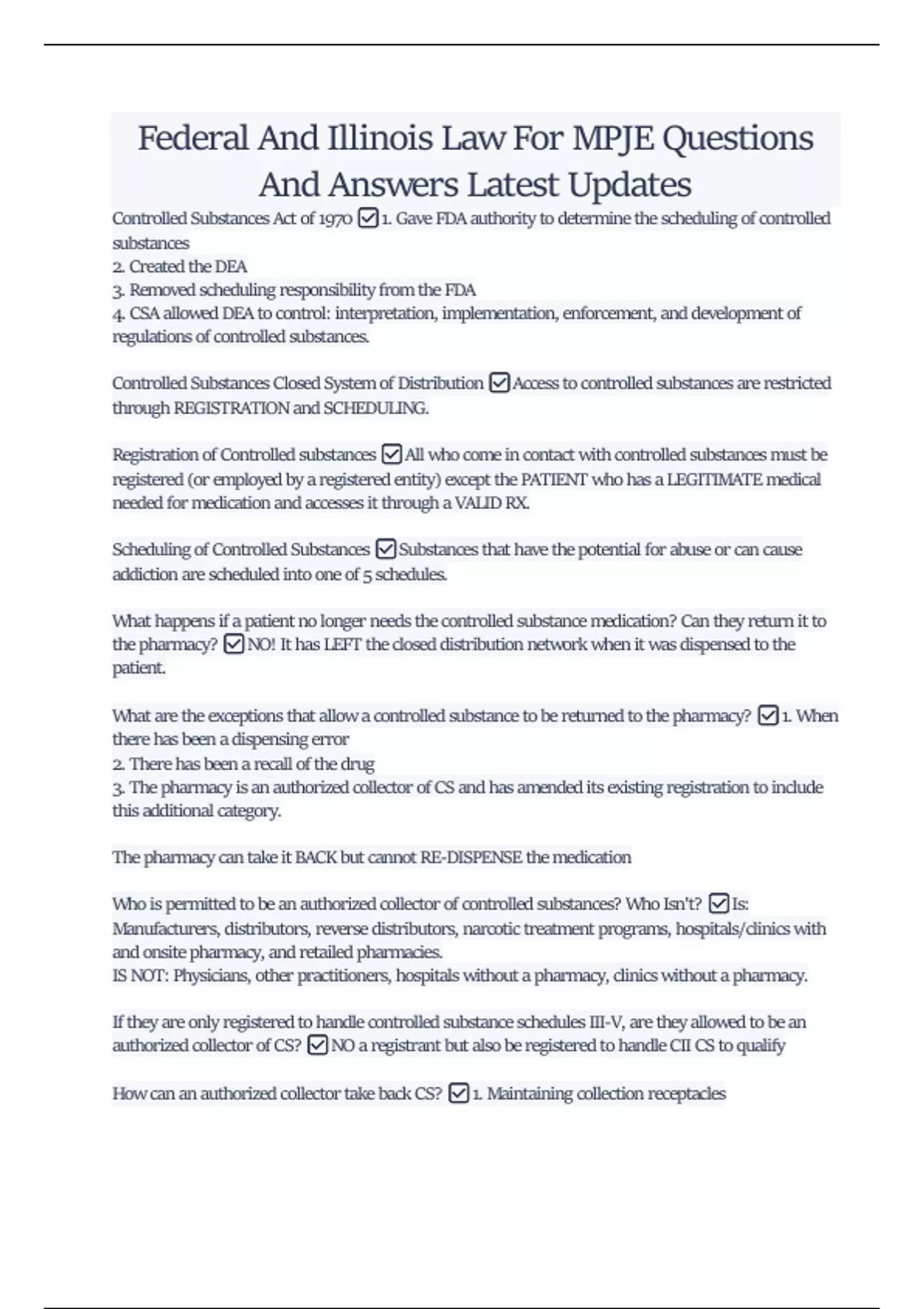Illinois MPJE Verified Package Deal With Complete Questions And Answers 100% Correct Pack MPJE Illinois Complete Study Questions And Answers With Latest Set Illinois Pharmacy Law For MPJE Verified Questions And Answers ILLINOIS MPJE Latest Questions And Answers 2023/2024 Updates