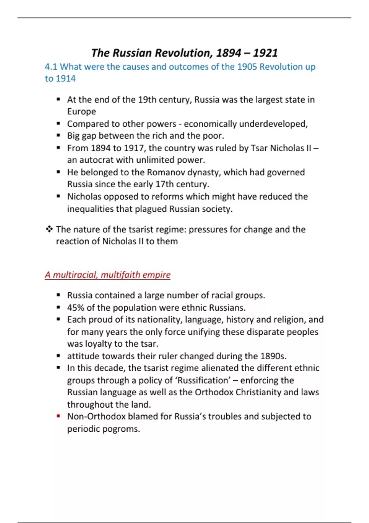 A full summary of the Russian revolution. It includes a summary of each individual chapter as well as a timeline of key dates from the start of the revolution to the Bolshevik consolidation of power. This is the cie 9489 syllabus
