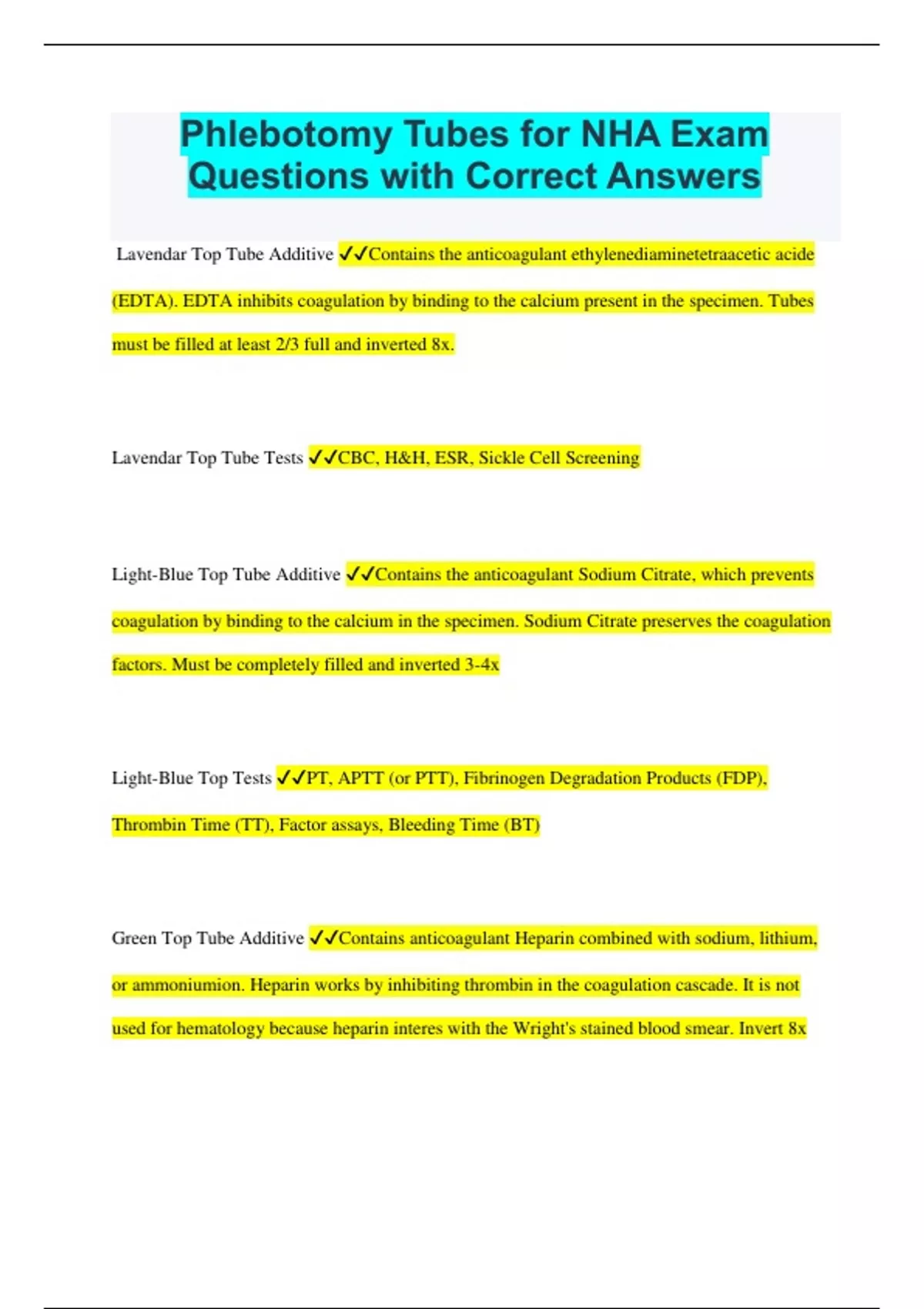 Phlebotomy Tubes for NHA Exam Questions with Correct Answers