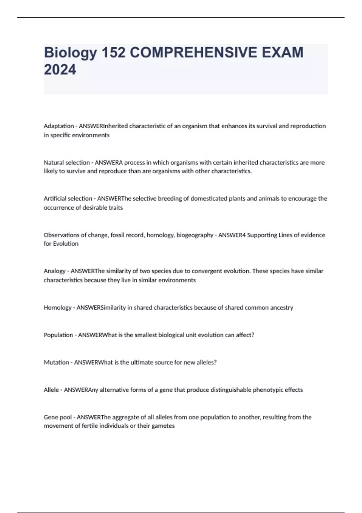 BIO 152 package deal comprehensive assessment 2024 question and answers