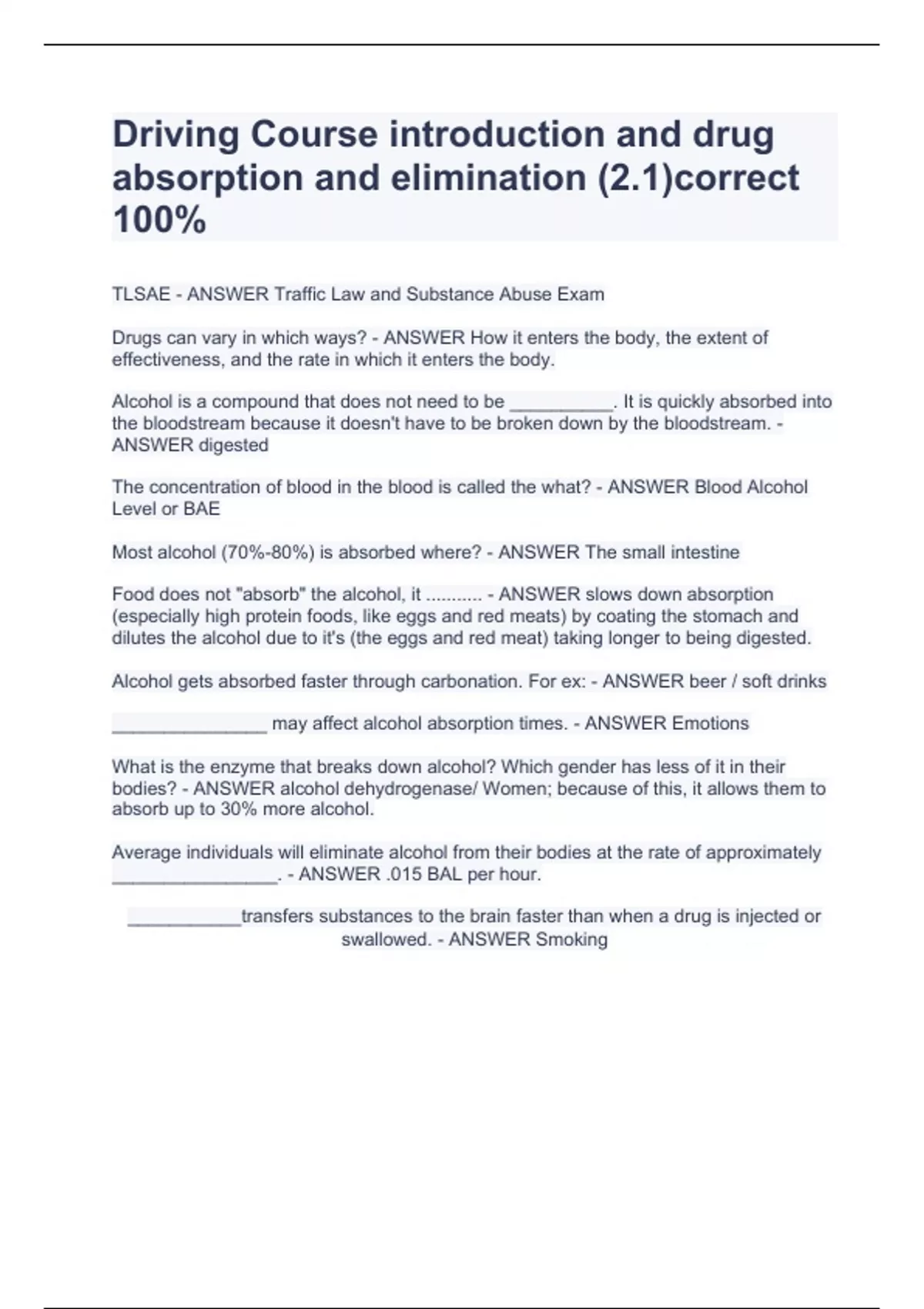 florida dmv drugs and alcohol test;Drug and alcohol permit ;TLSAE study guide ;Course Final Exam ;course level 3;course level 4;Driving Course introduction and drug absorption and elimination (2.1)