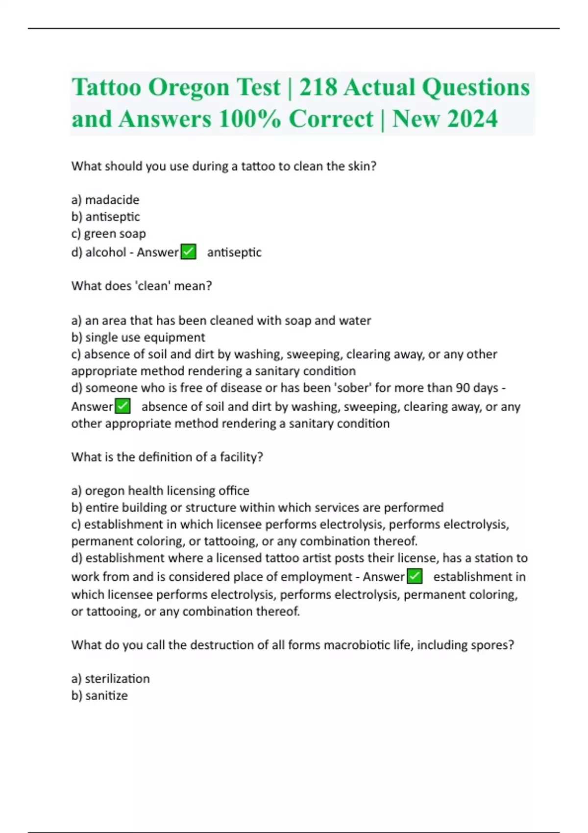 Oregon Tattoo Exam | 227 Actual Questions and Answers 100% Correct | New Update 2024