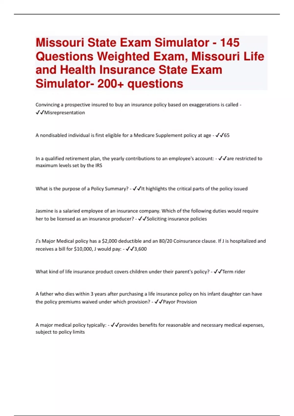 Missouri State Exam Simulator - 145 Questions Weighted Exam, Missouri Life and Health Insurance State Exam Simulator- 200+ questions and (VERIFIED) answers rated A