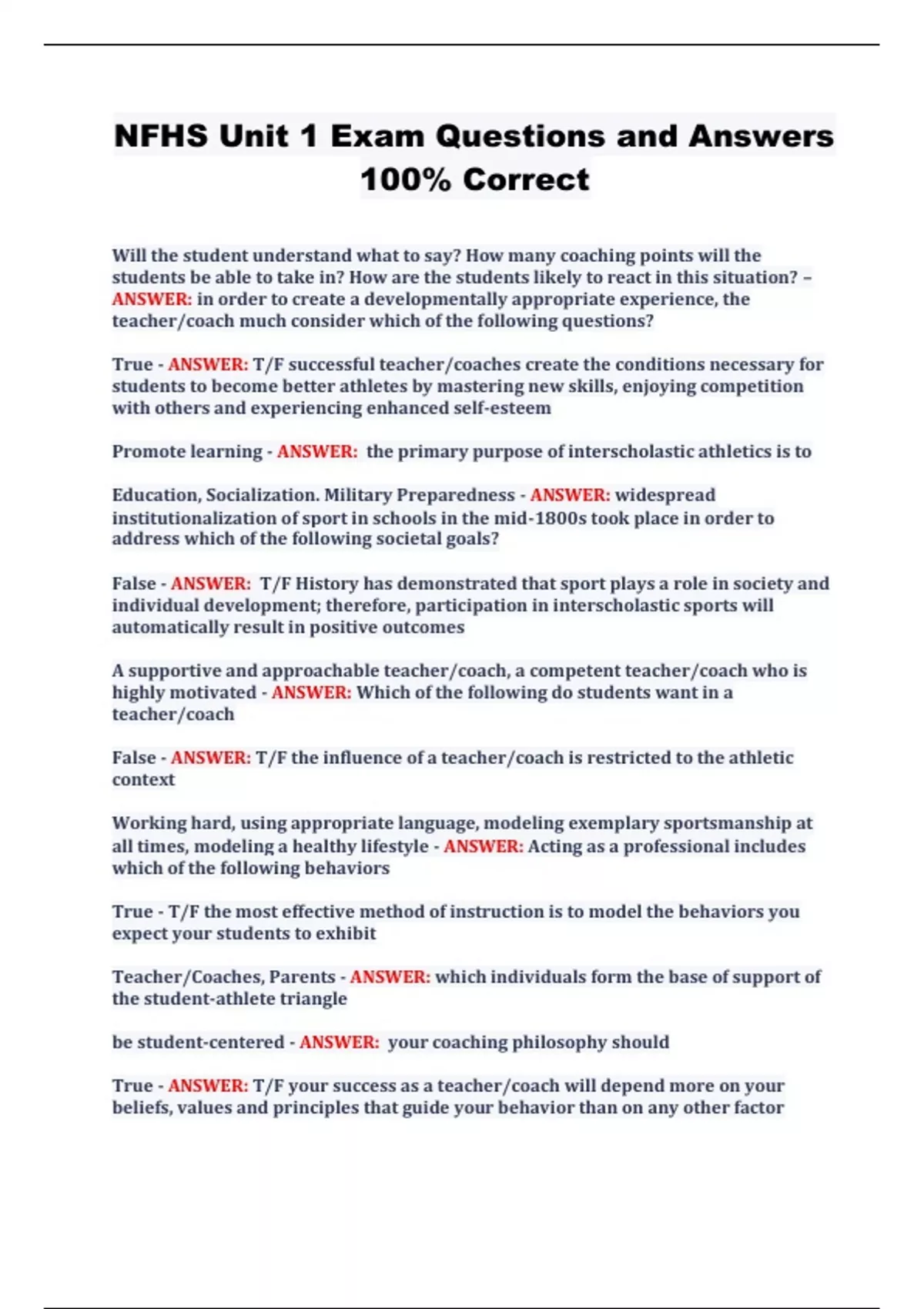 NFHS Principles of Coaching Exam Questions And Answers RATED A+