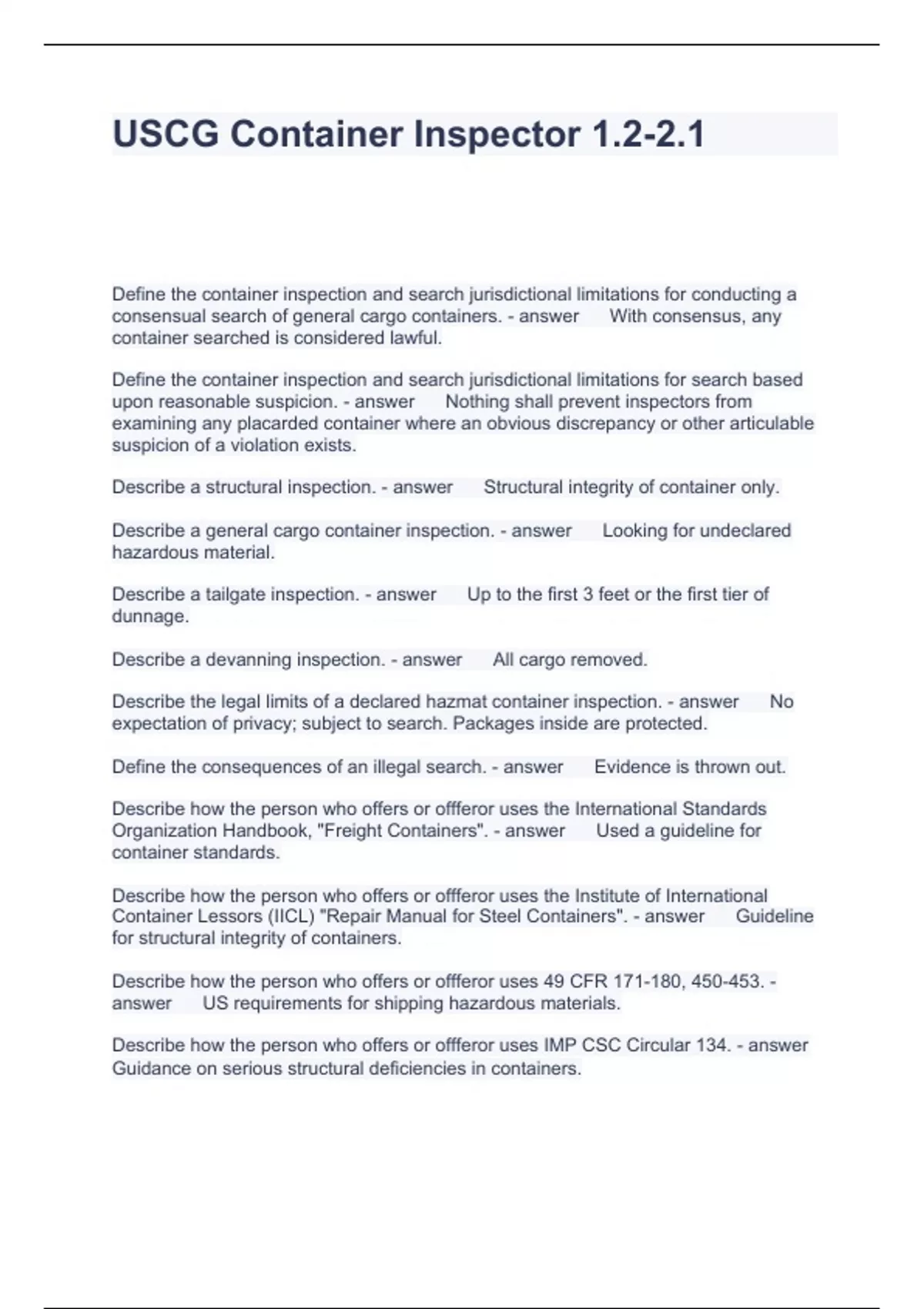 Exam (elaborations) Container Qual Questions and Answers Graded A+ Exam (elaborations) Containers & Explosives Questions with solutions 2024 Exam (elaborations) CSC container Course Questions and Answers 2024 Exam (elaborations) ICS 100c final exam Questions and Answers 100% Accurate 2024 Exam (elaborations) IICL Chassis Inspector Exam Que