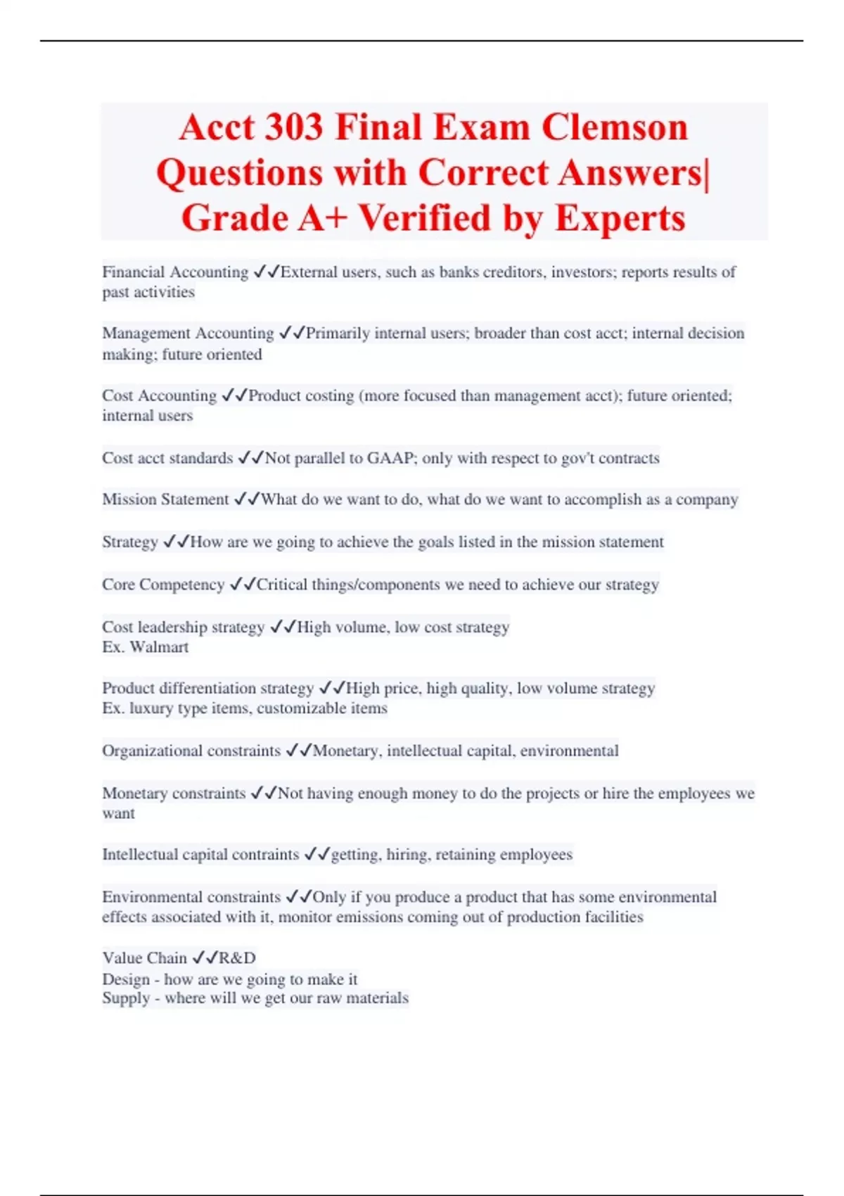 TOP GRADES FOR VERIFIED LEARNERS!!! Ace Your Studies with Our Exams, Test Banks & Study Guides! Looking for reliable study materials? We’ve got you covered—Nursing, Business, Science, Engineering, and more! Access exams, test banks, and guides that help you study smarter and achieve top grades. Need something specific? Contact us and get it instantly! Loved your purchase? Leave a quick review to boost satisfaction and help other students succeed. Also, refer 2 colleagues to this page and get one document free. All the best in your Career.