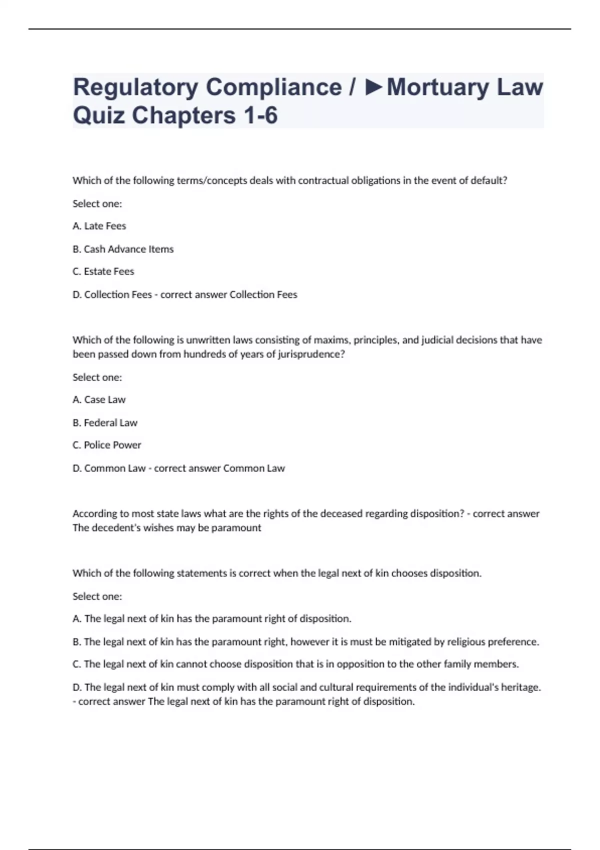 Exam (elaborations) Exam 1 Study Guide Mortuary Jurisprudence Question and answers 100% correct 2023/2024 Exam (elaborations) Jurisprudence Exam Question and answers rated A+ 2023/2024 Exam (elaborations) Jurisprudence PA Questions with complete solution 2023/2024 Exam (elaborations) MCC Mortuary Science Mortuary Law Exam 1 Question and answe