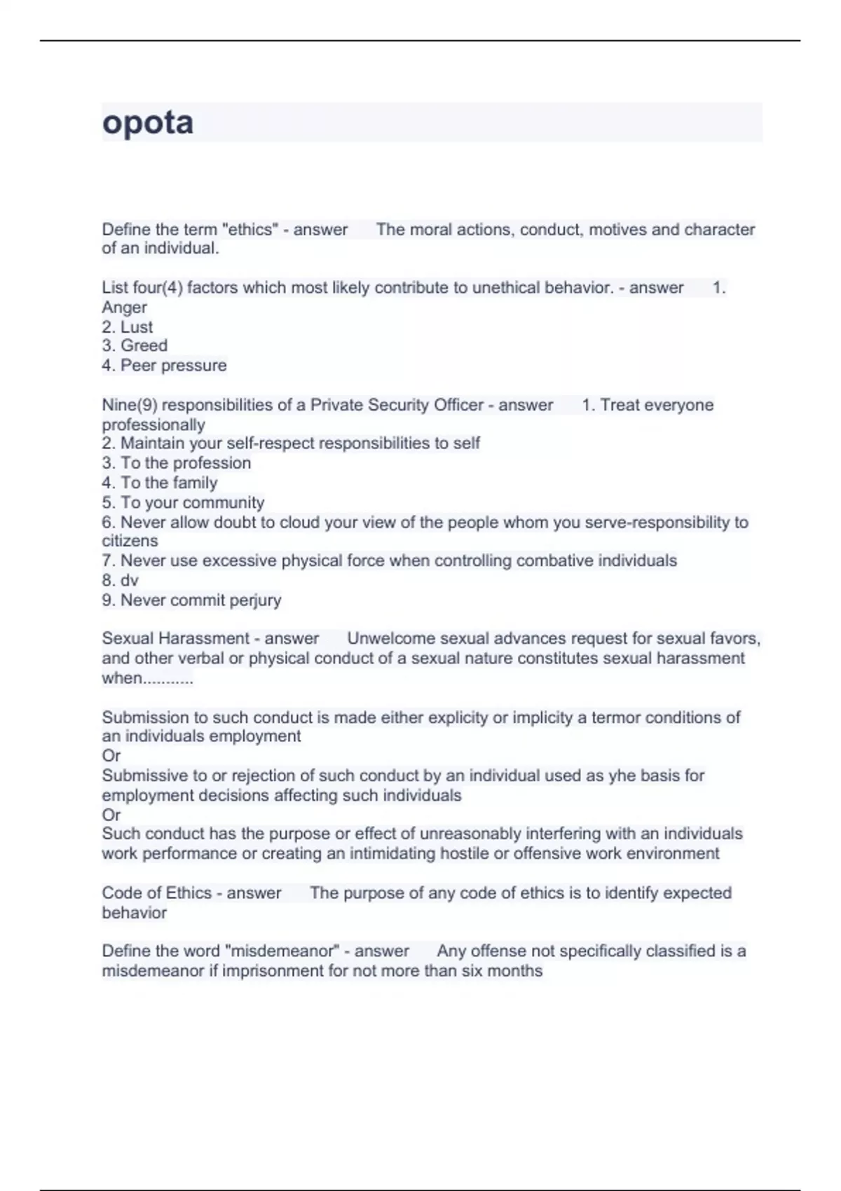 Exam (elaborations) 2024 OPOTA (SPOs) Student Performance Objectives Questions and Answers 100% correct Exam (elaborations) 2024 Opota Ohio Peace Officer Basic Questions with correct Answers 2024 Exam (elaborations) OPOTA QUESTIONS WITH CORRECT ANSWERS Exam (elaborations) OPOTA 2024 (new) QUESTIONS AND ANSWERS 2024 Exam (elaborat