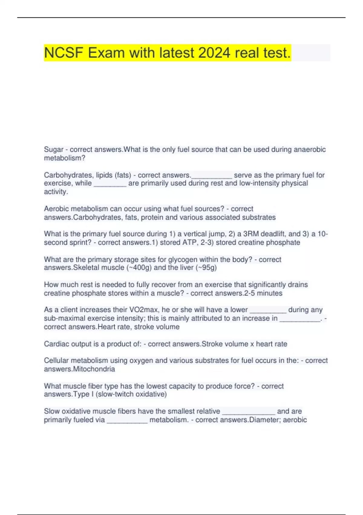 NCSF Practice test 1 with updated 2024 test.NCSF Unit 1 exam with latest questions and answers.NCSF CPT Exam Prep Cards questions and answers well illustrated.NCSF Exam with latest 2024 real test.NCSF FINAL EXAM questions and answers well illustrated latest update 2024.