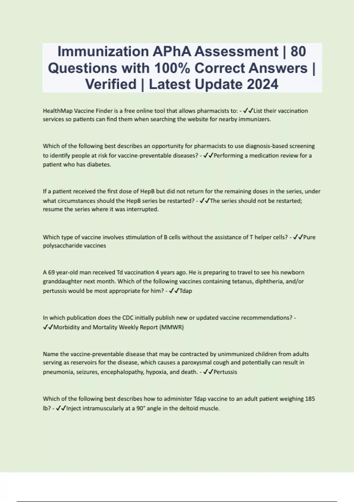 APhA Immunization Exam | Questions with 100% Correct Answers | Verified | Latest Update 2024