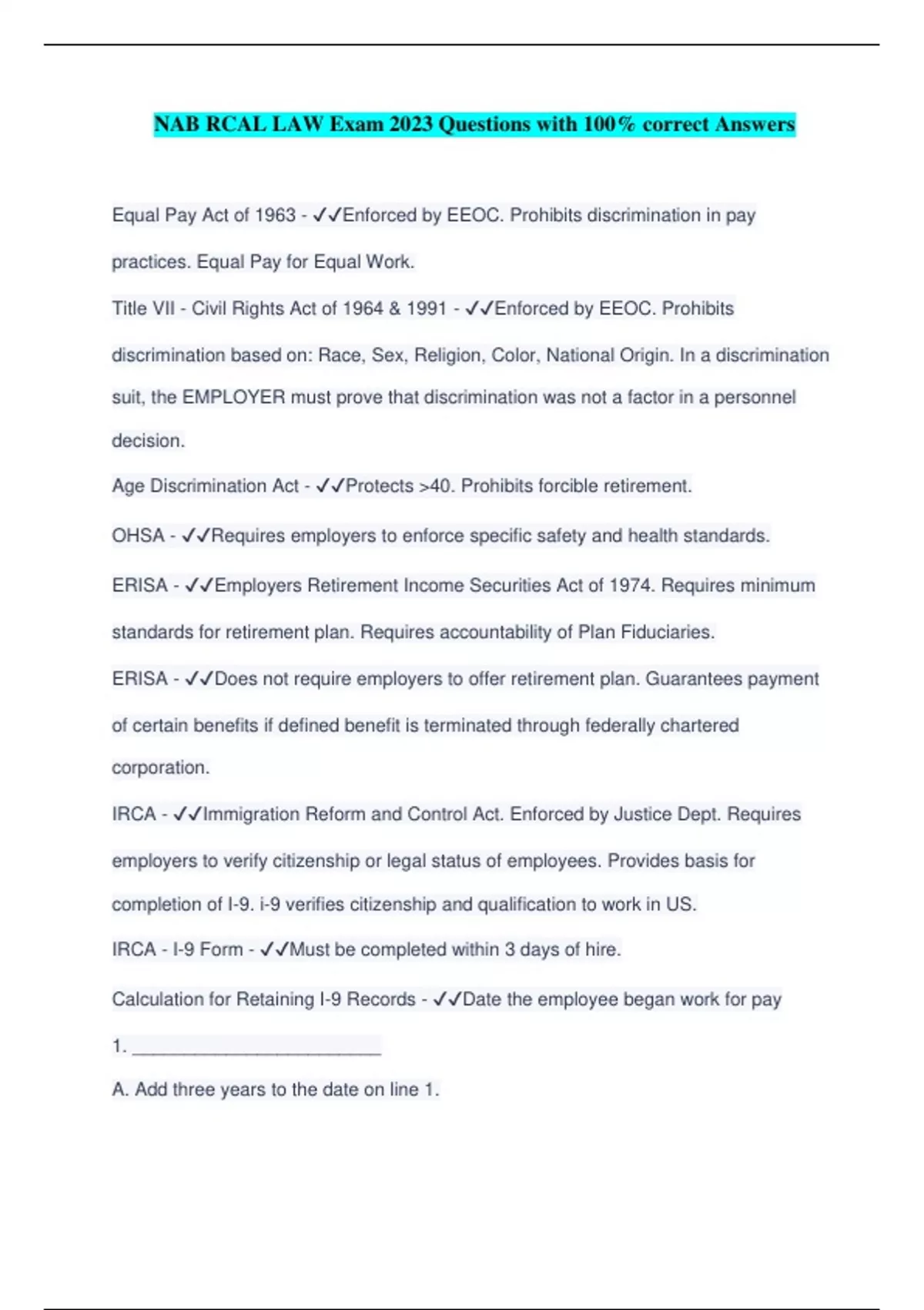 NAB RCAL LAW Exam 2023 Questions with 100% correct Answers