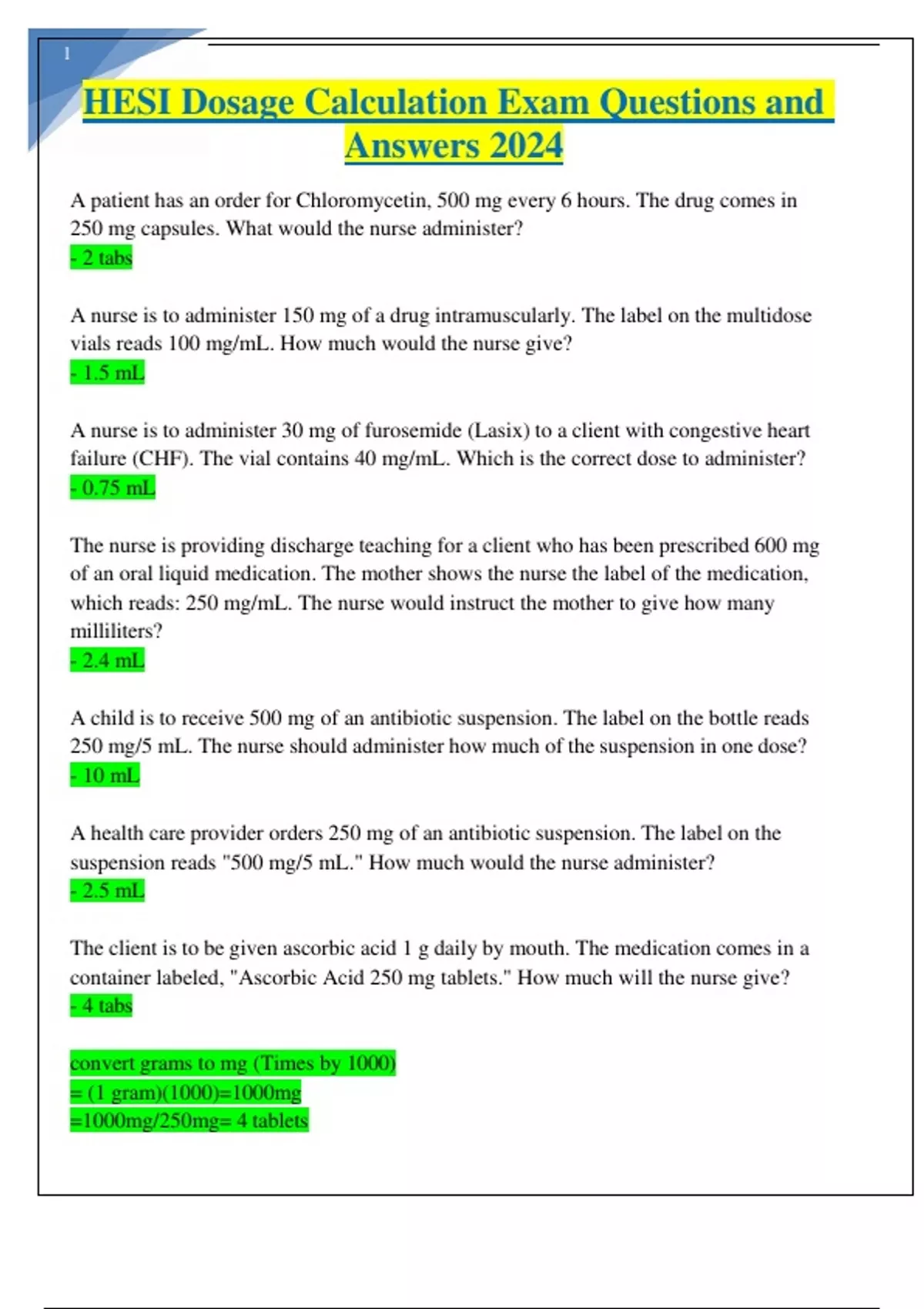 HESI Dosage Calculation Exam Questions and Answers 2024.
