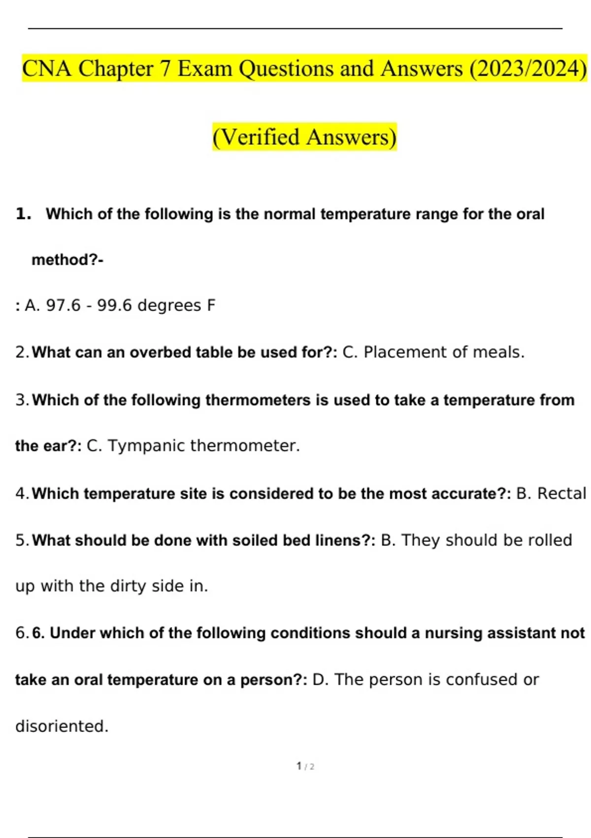 CNA Chapter 1 - 10 Exams Questions and Answers (2022/2023) (Verified Answers)