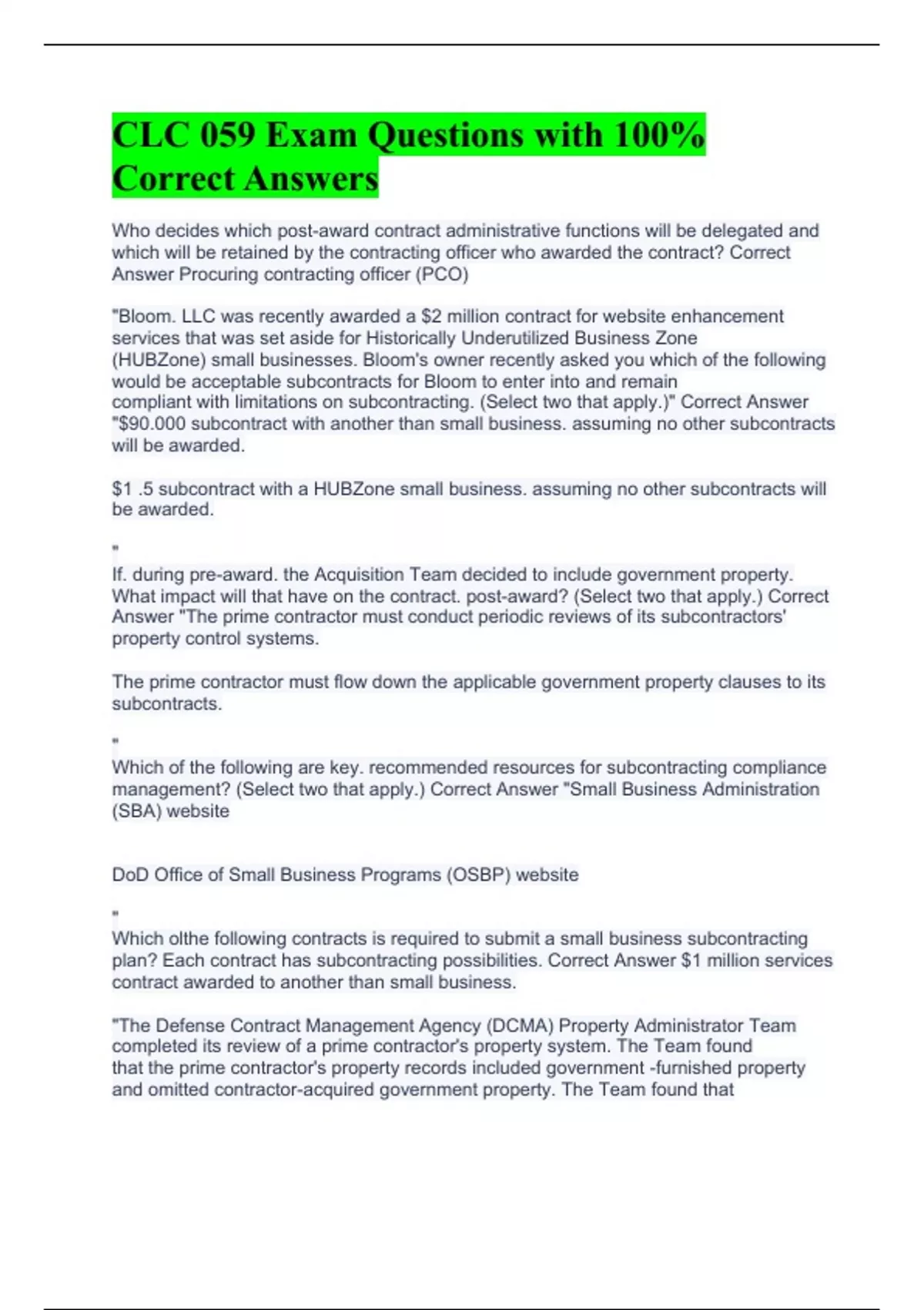 CLC 059 Exam Questions with 100% Correct Answers CLC 059 Subcontracting Exam Questions with 100% Correct Answers CLC 059 Management of Subcontracting Compliance Questions with 100% Correct Answers CLC 059 Exam Questions with 100% Correct Answers