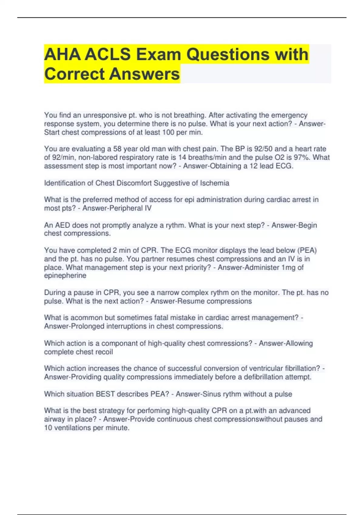 AHA ACLS Review Test Questions and Answers All Correct 2 Exam (elaborations) AHA ACLS 2021 Pre-Test Questions with Correct Answers 3 Exam (elaborations) ACLS AHA Exam Questions with Correct Answers 4 Exam (elaborations) AHA ACLS Review Exam Questions and Answers All Correct 5 Exam (elaborations) AHA ACLS Review Questions with Correct Answers 6