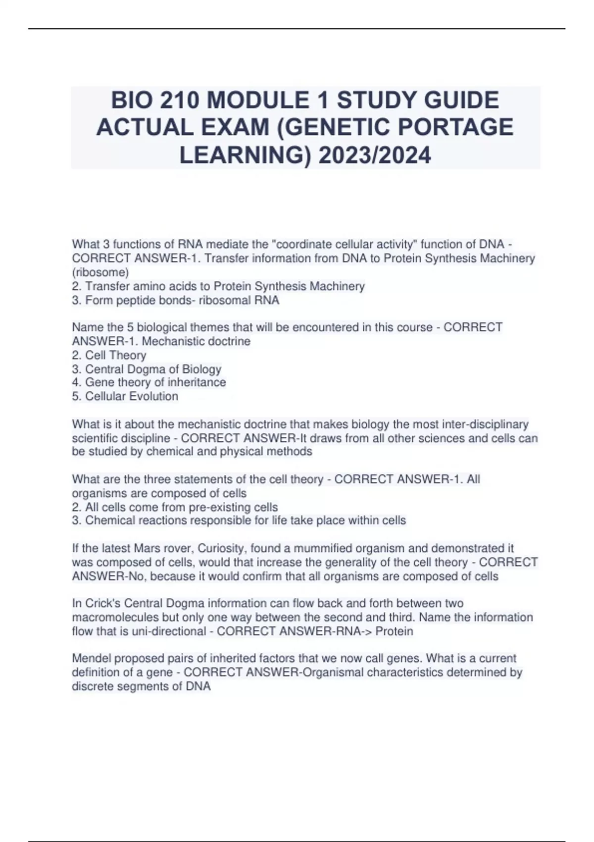 Package deal for BIO 210 MODULE 1 STUDY GUIDE ACTUAL EXAM (GENETIC PORTAGE LEARNING) 2023/2024