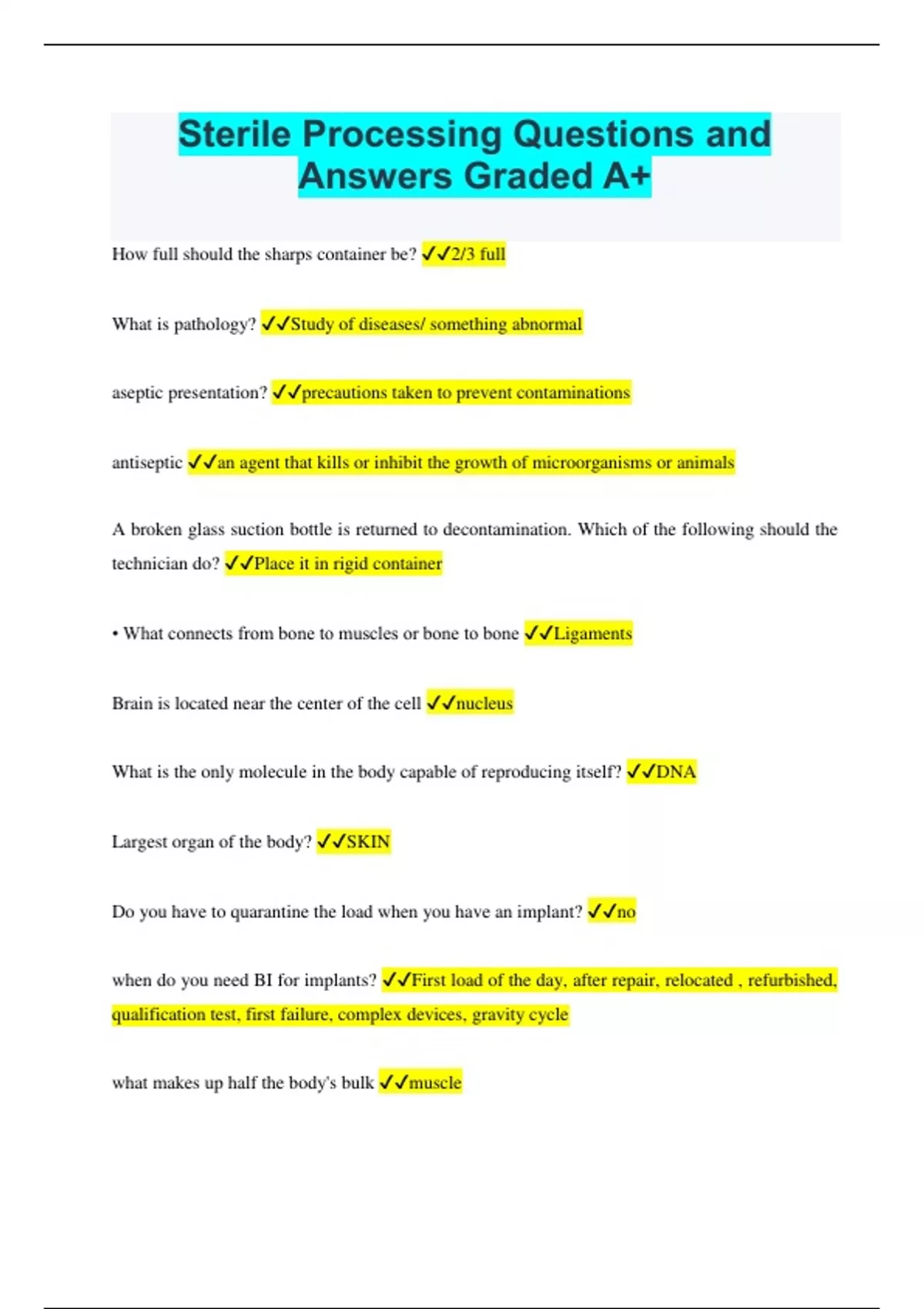 MICROBIOLOGY STERILE PROCESSING TECHNICIAN QUESTIONS AND ANSWERS GRADED A sterile processing department (SPD) questions and answers 100% pass Sterile Processing Questions and Answers Latest Updated 2023 Rated A Sterile Processing - Final Exam Questions and Answers Already Passed STERILE PROCESSING EXAM LATEST UPDATED 2023 RATED A Sterile Processin