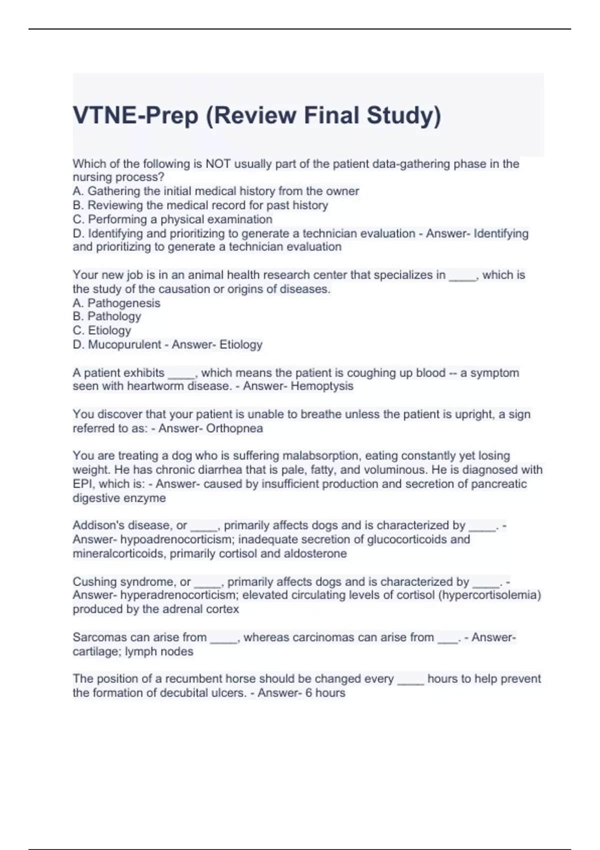 1 Exam (elaborations) VTNE-Prep (Review Final Study) Questions and Answers 2 Exam (elaborations) VTNE Study Exam Questions with correct Answers 3 Exam (elaborations) VTNE review exam questions and answers 4 Exam (elaborations) VTNE Review Exam Questions and Answers 5 Exam (elaborations) VTNE prep hard questions 2 with correct answers 6 Exam (e