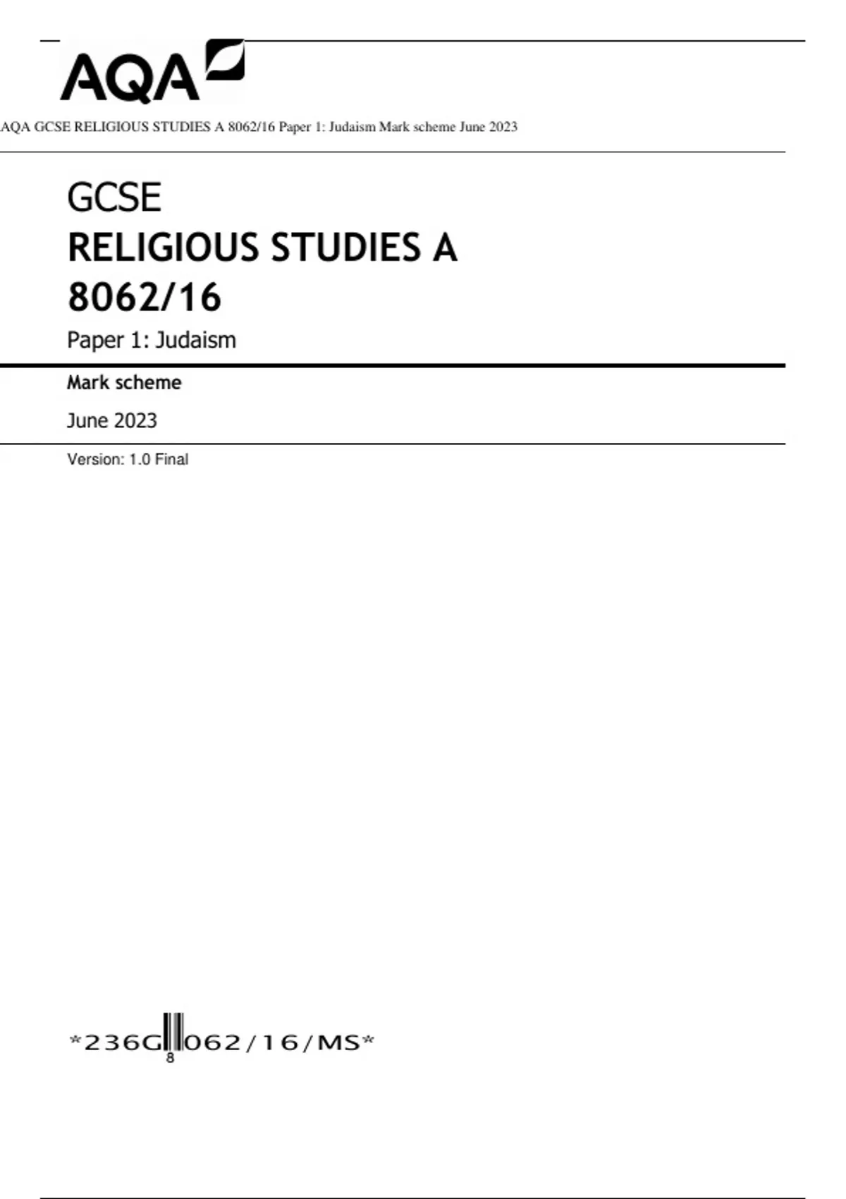 AQA GCSE RELIGIOUS STUDIES A 8062/16 Paper 1: Judaism Mark scheme June 2023