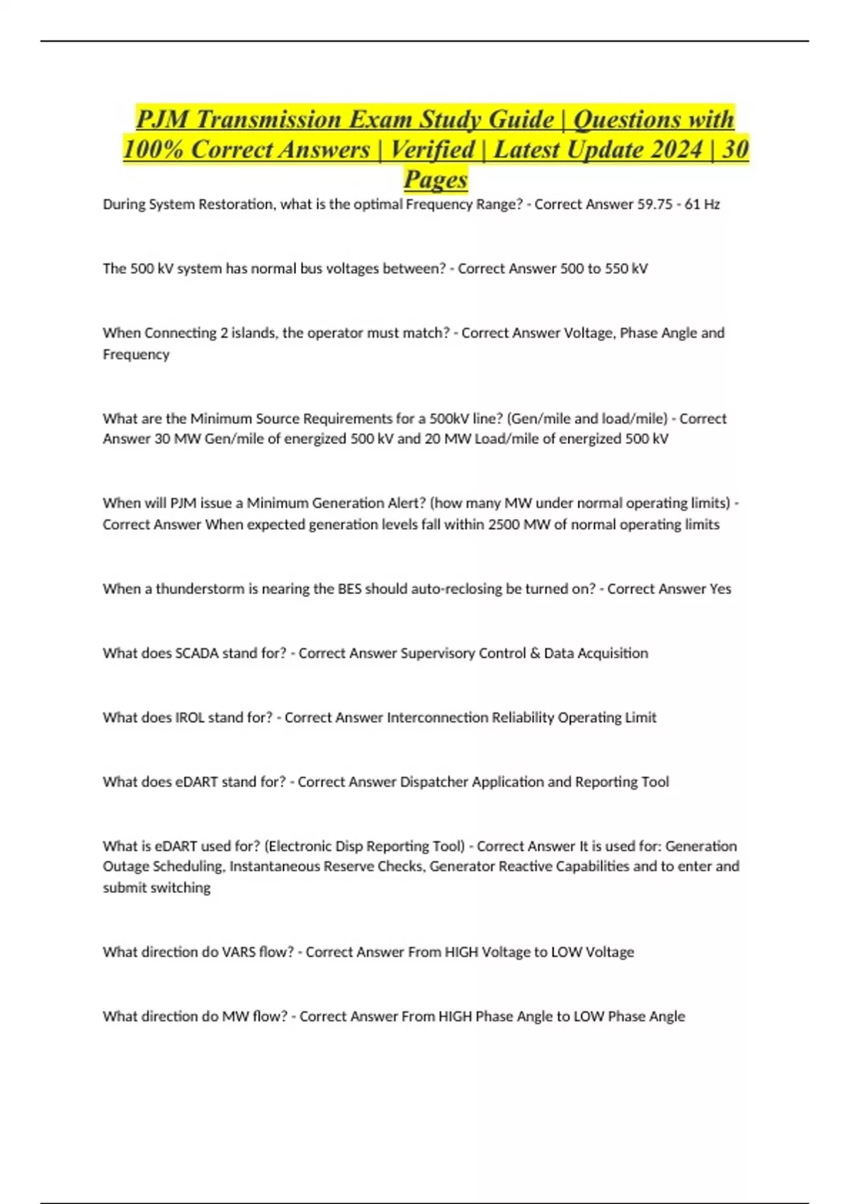 PJM Transmission Exam Study Guide | Questions with 100% Correct Answers | Verified | Latest Update 2024 | 30 Pages