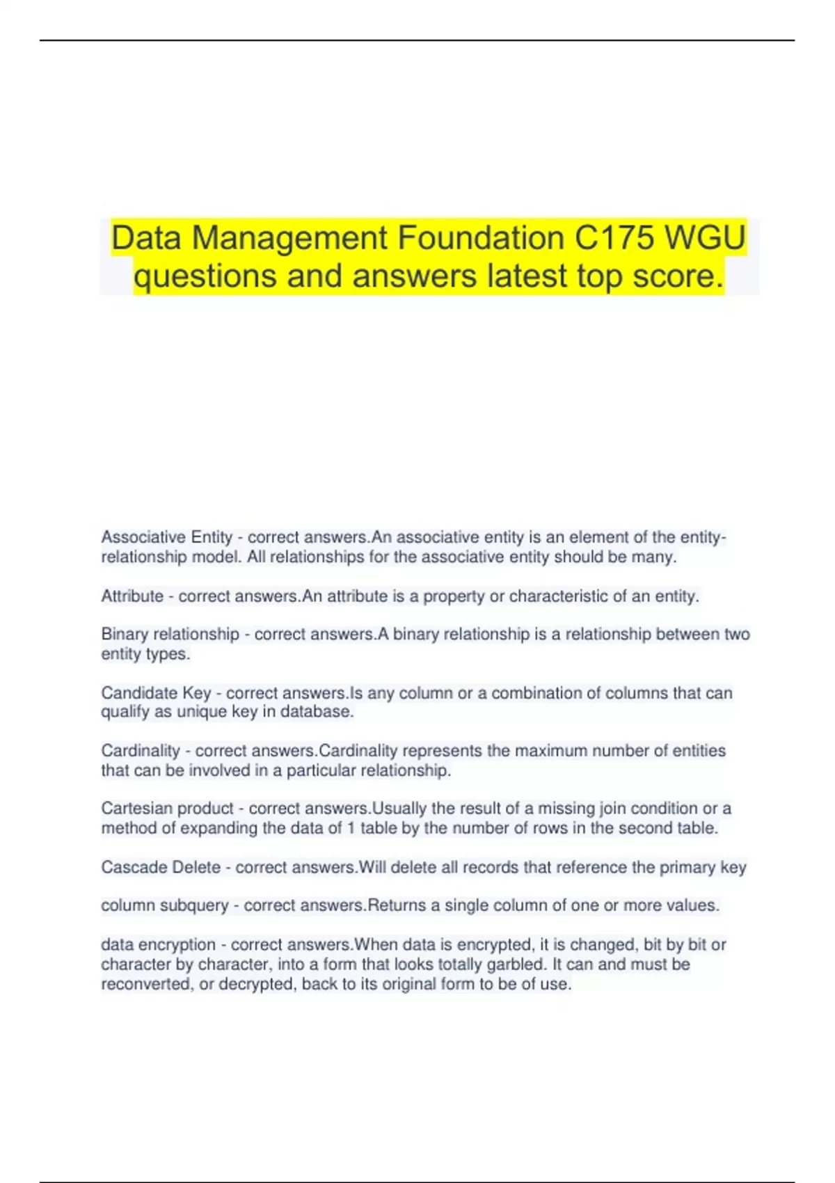 Data Management Foundation C175 WGU questions and answers latest top score.WGU C175 Study Notecards questions and answers well illustrated.WGU C175 Pre-Assessment questions and answers latest top score.Introduction to Analytics - D491 questions and answers latest top score.
