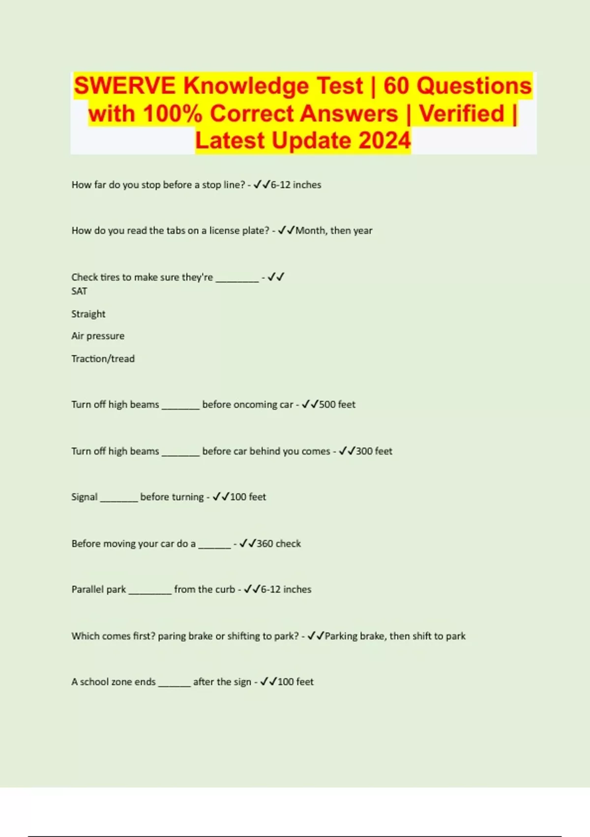 Swerve Driving School Knowledge Test | Questions with 100% Correct Answers | Verified | Latest Update 2024