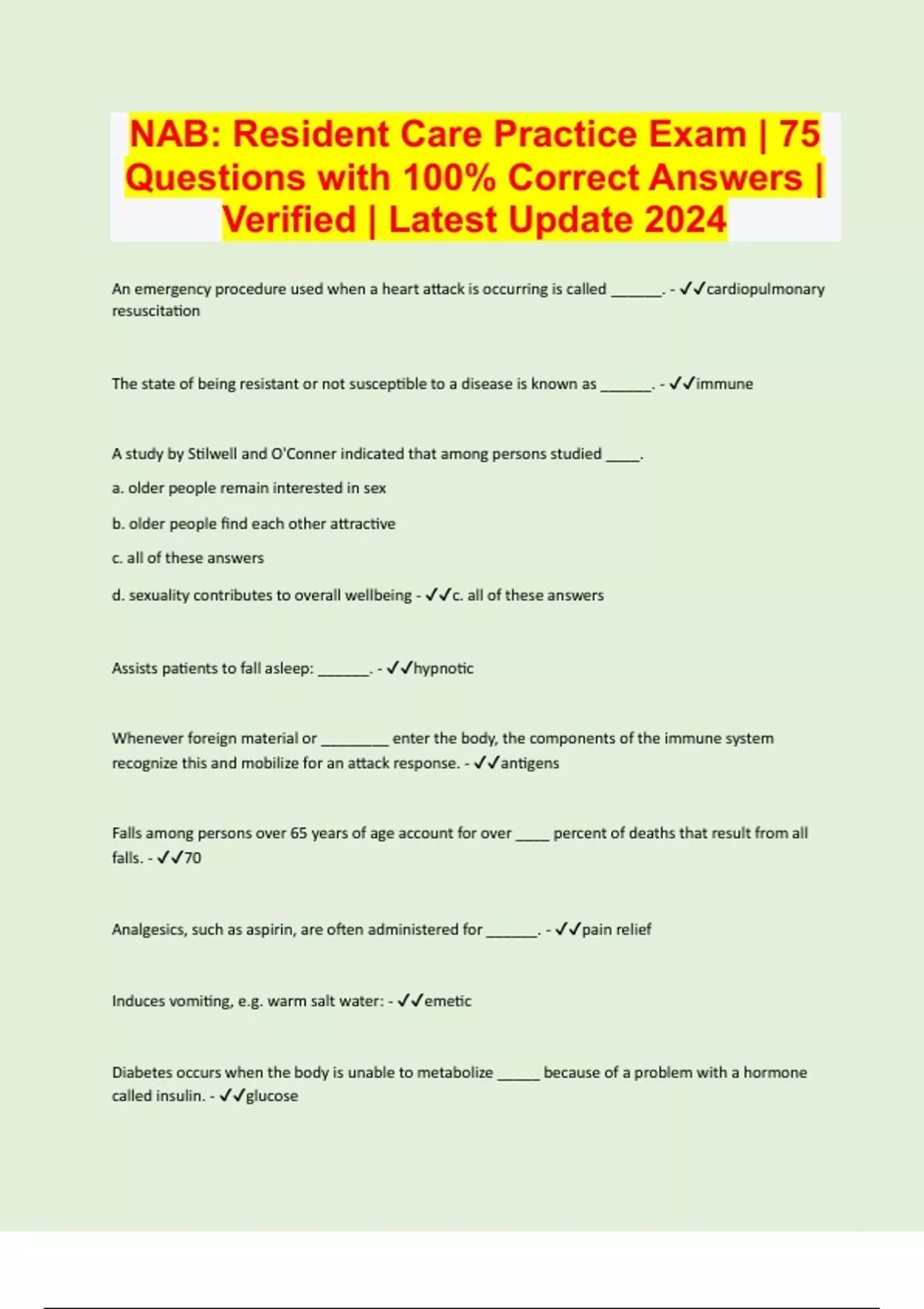 NAB: Resident Care Practice Exam | 75 Questions with 100% Correct Answers | Verified | Latest Update 2024