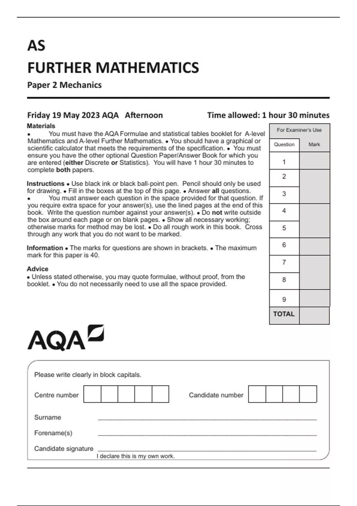 AQA AS FURTHER MATHEMATICS Paper 2 Mechanics 7366-2M-QP-FurtherMathematics-AS-19May23