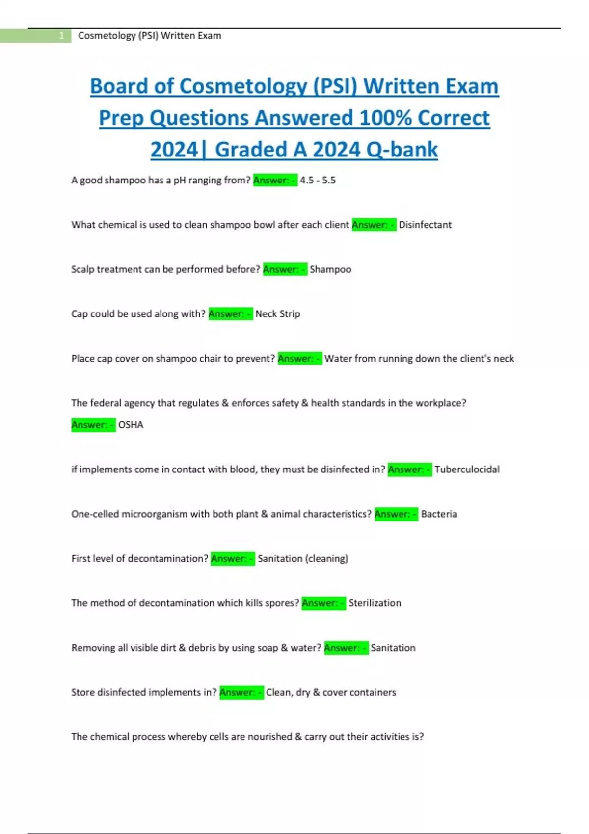 All; PSI Cosmetology Exam| PSI Cosmetology Practice Test/Practice Questions Solved 100% Correct /2024 Brand New Questions