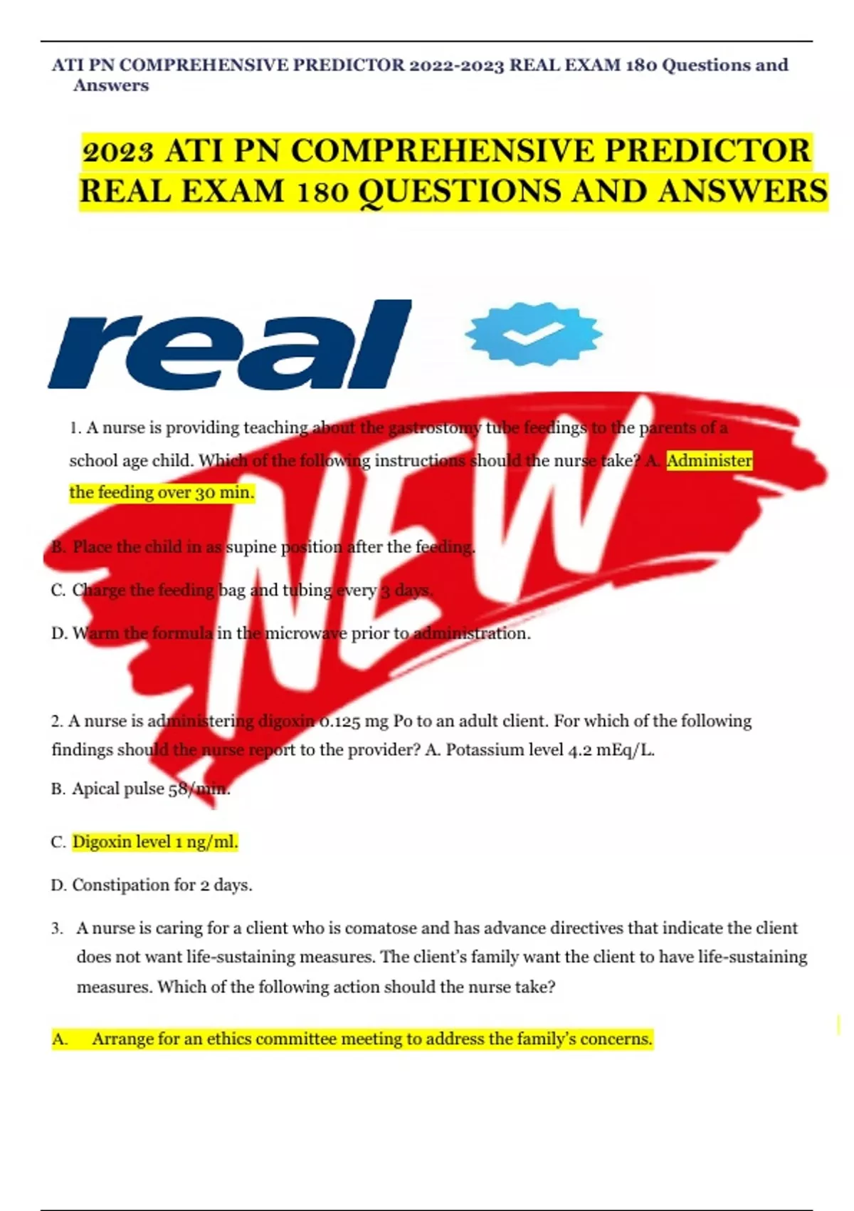 2023 ATI PN COMPREHENSIVE PREDICTOR REAL EXAM 180 VERIFIED QUESTIONS AND ANSWERS ATI PN COMPREHENSIVE PREDICTOR REAL EXAM 180 Questions and Answers