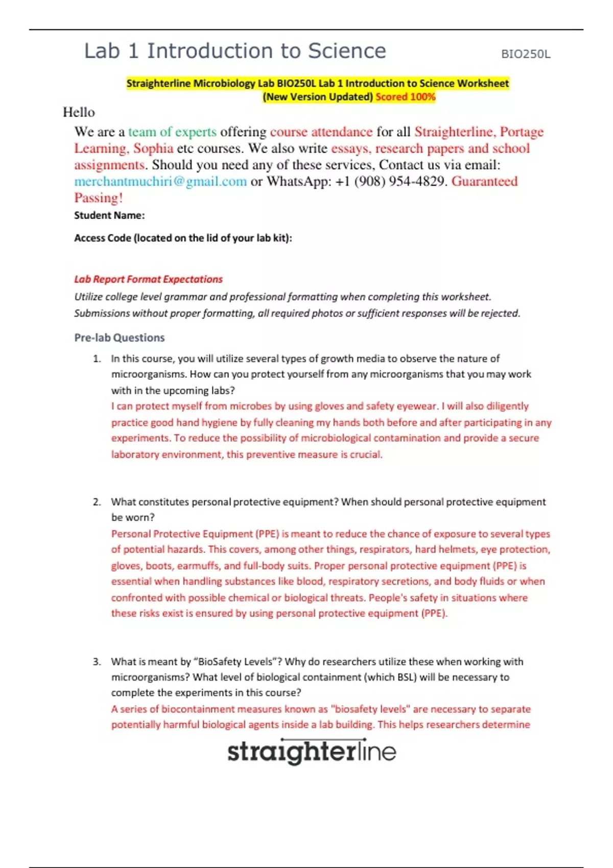 Straighterline Microbiology Lab BIO250L LABS 1, 2, 3, 4, 5, 6, 7 & 8 Bundled Worksheets ( Newest Version) All Scored 100%