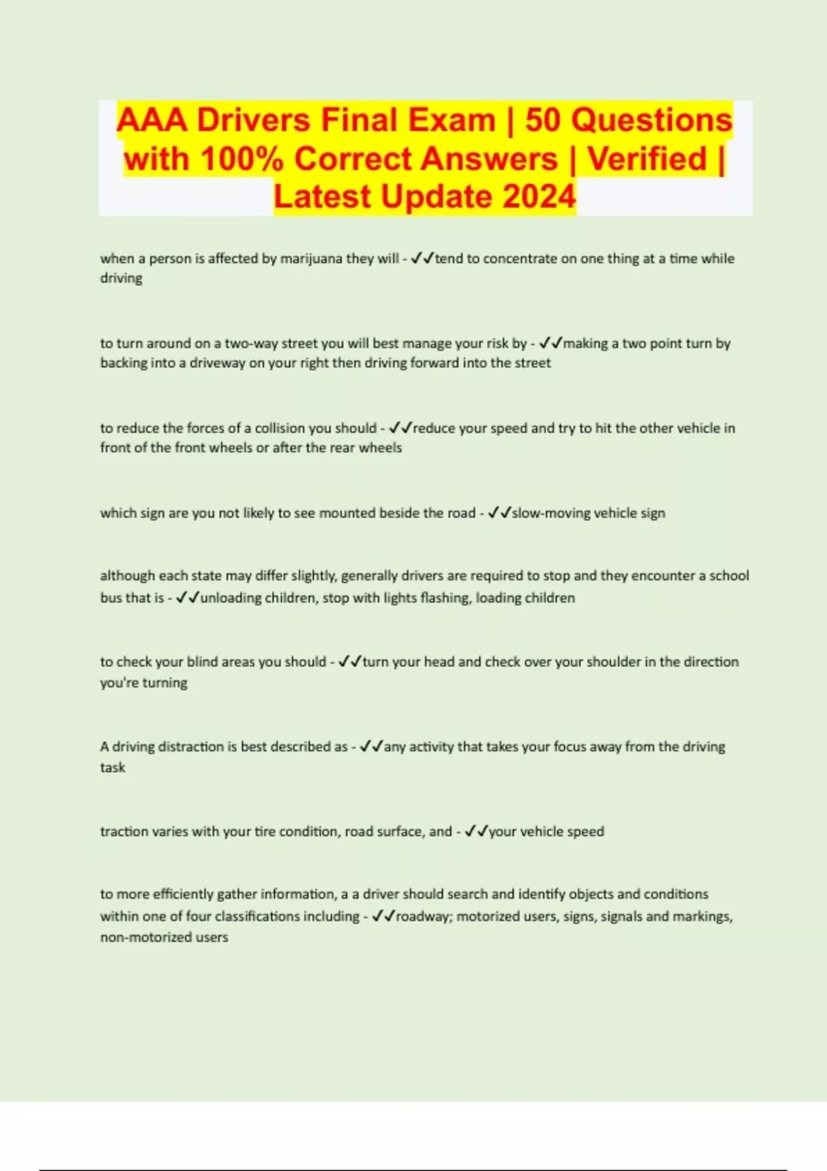 AAA Drivers Final Exam | 50 Questions with 100% Correct Answers | Verified | Latest Update 2024