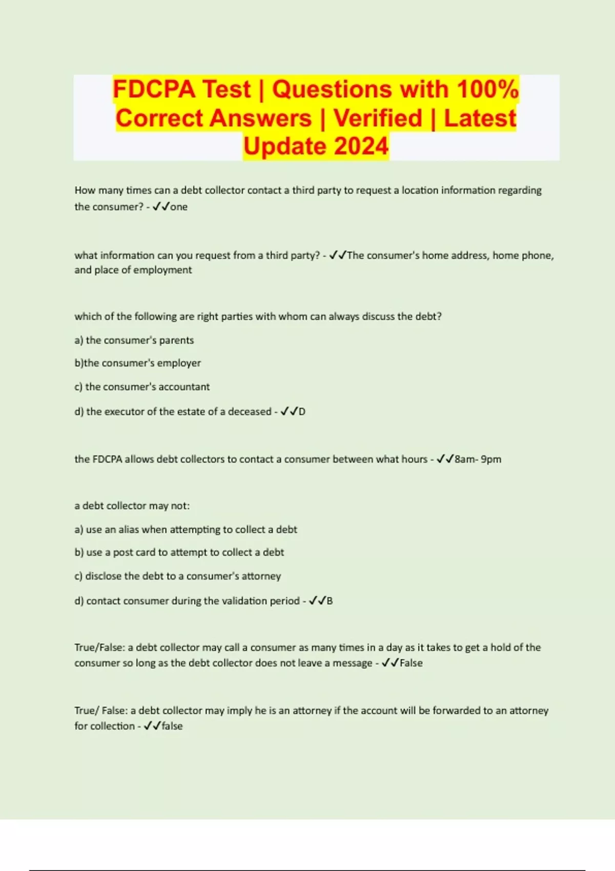 Fair Debt Collections Practices Act (FDCPA) Questions with 100% Correct Answers | Verified | Latest Update 2024