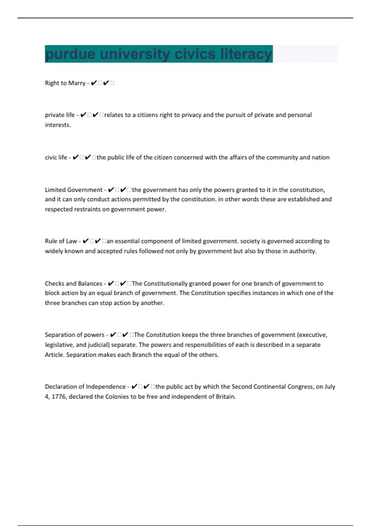 purdue university civics literacy 74 Review | Questions with 100% Correct Answers | Verified
