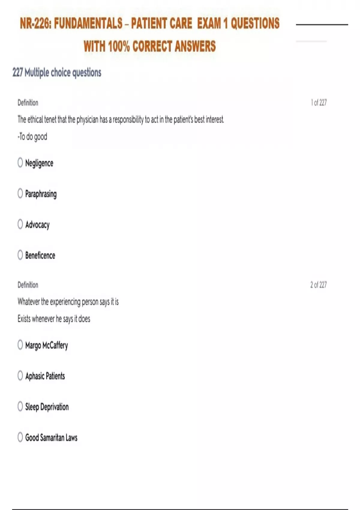NR 226 FUNDAMENTALS PATIENT CARE EXAM 1 (A) QUESTIONS WITH 100% CORRECT ANSWERS
