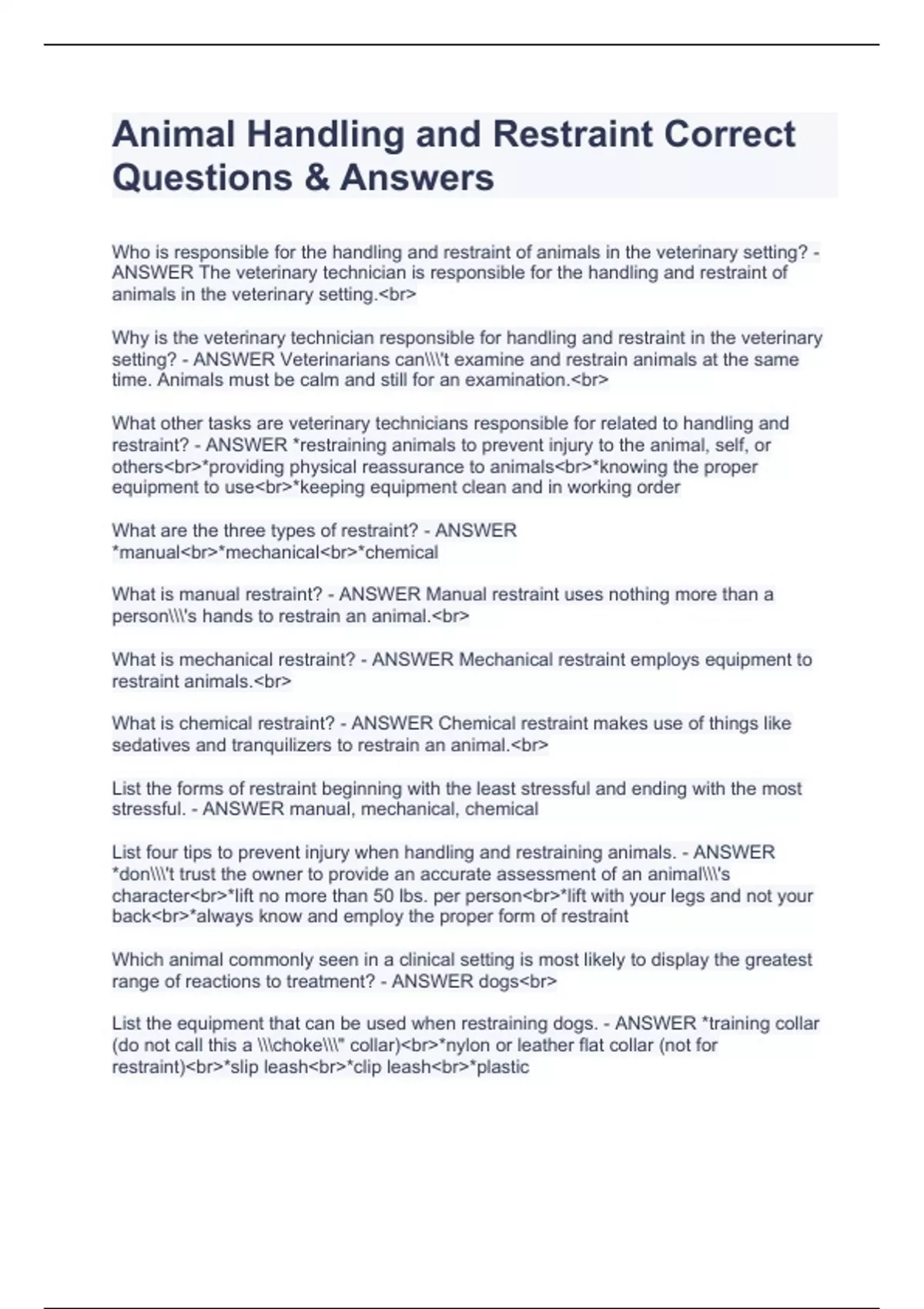 Animal handling and Restraint FINAL EXAM CORRECT 100% COMPLETE PACKAGE DEALAnimal handling and Restraint FINAL EXAM CORRECT 100% COMPLETE PACKAGE DEALAnimal handling and Restraint FINAL EXAM CORRECT 100% COMPLETE PACKAGE DEALAnimal handling and Restraint FINAL EXAM CORRECT 100% COMPLETE PACKAGE DEAL