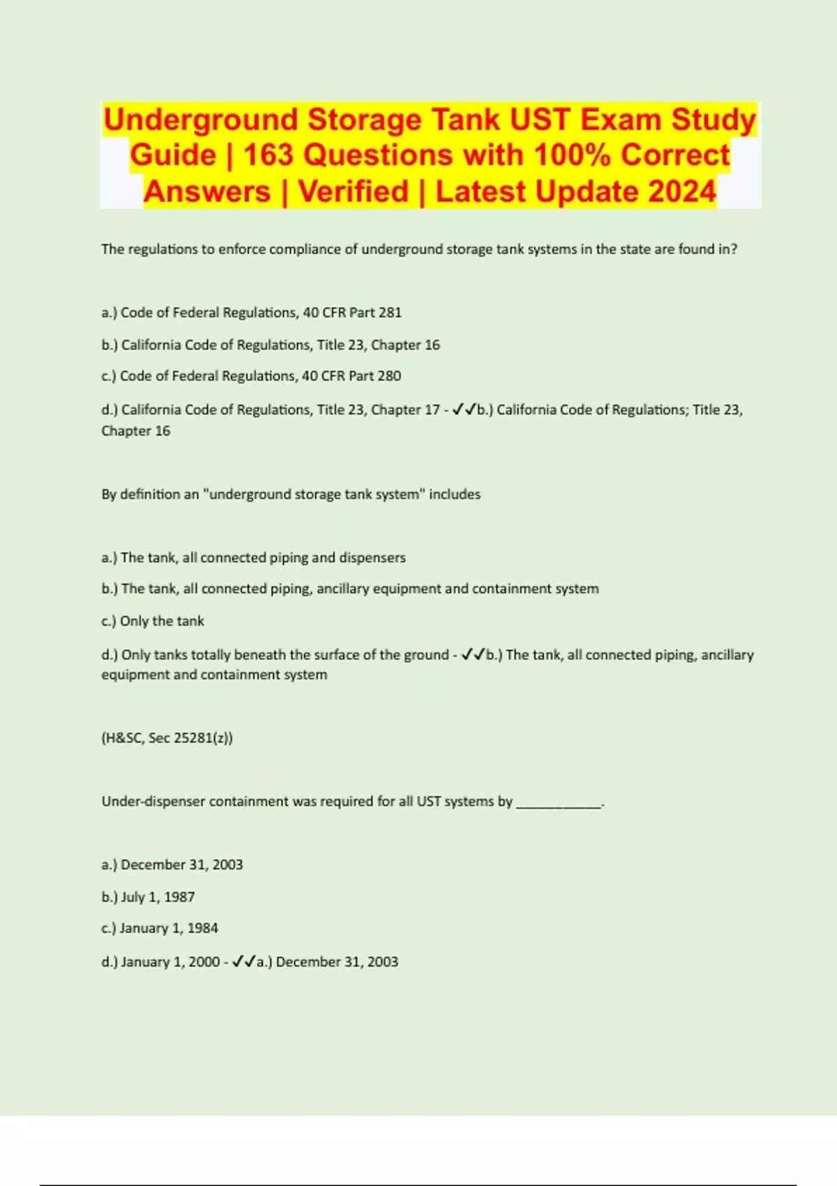 Underground Storage Tank UST Exam Study Guide | 163 Questions with 100% Correct Answers | Verified | Latest Update 2024