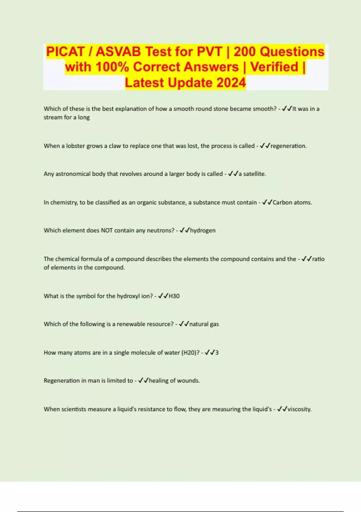 PICAT / ASVAB Test for PVT | 200 Questions with 100% Correct Answers | Verified | Latest Update 2024